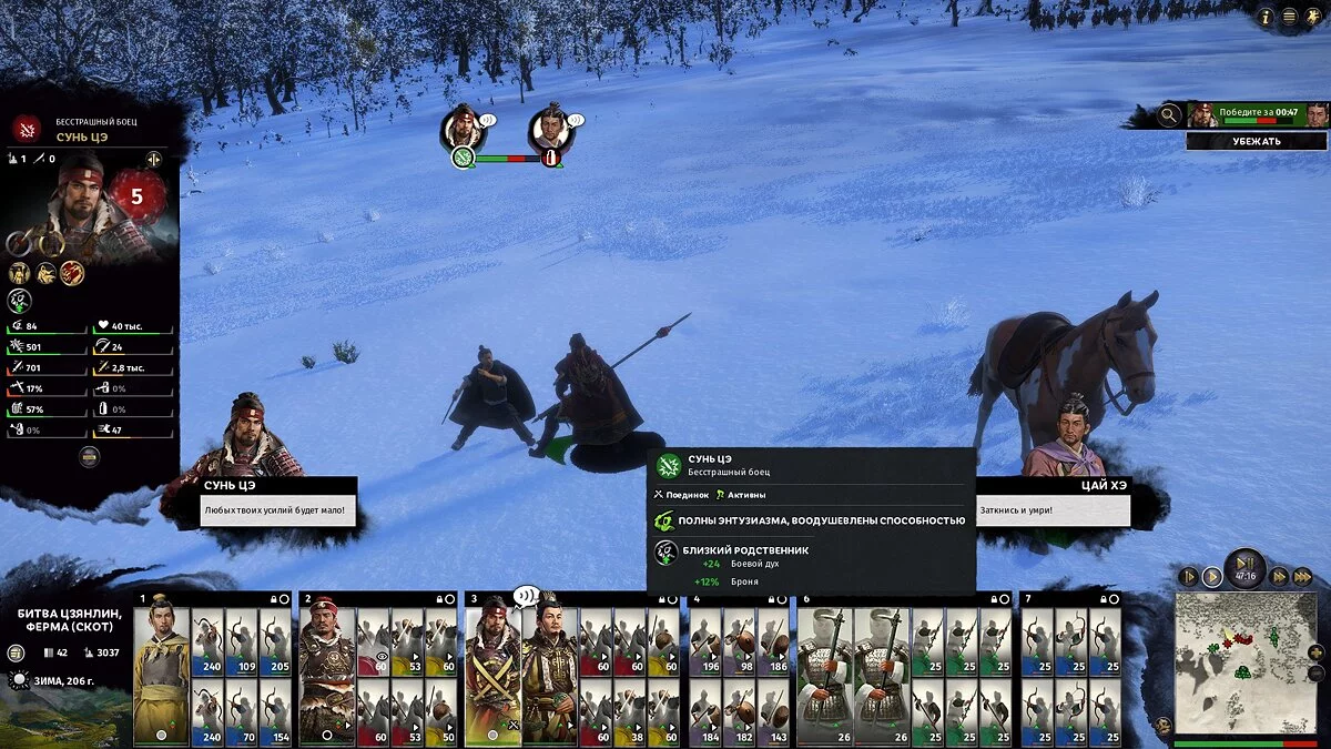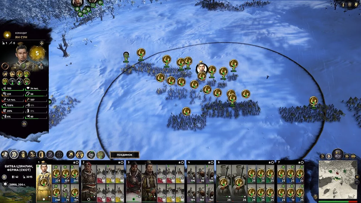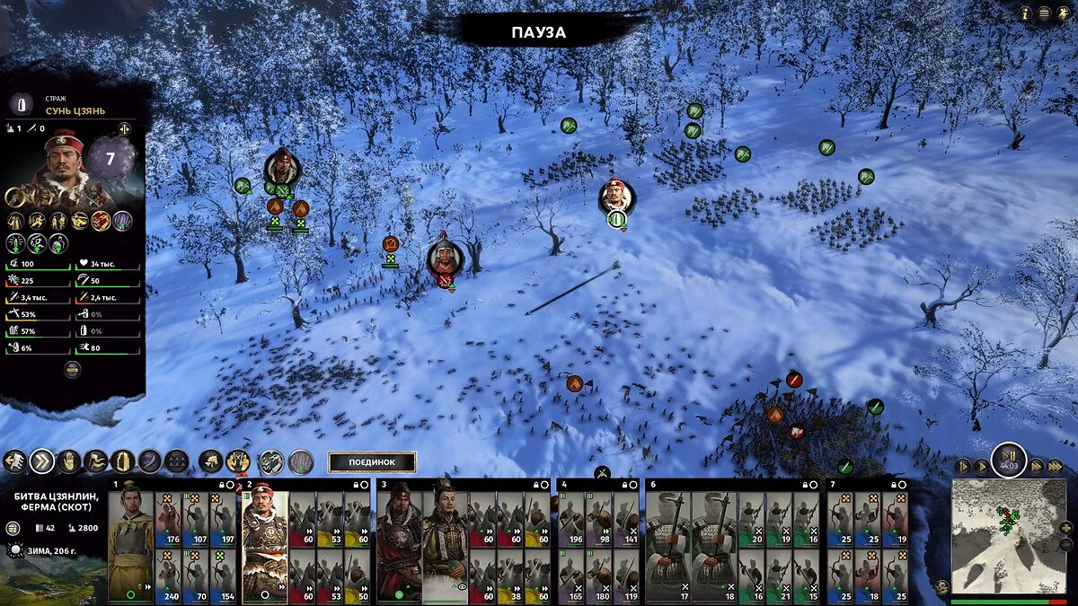Игра покажет список персонажей вражеской армии, готовых вступить в бой с выбранным (это важно) полководцем. Вы можете выбрать другого своего полководца, и у него будет другой набор желающих биться с ним персонажей.