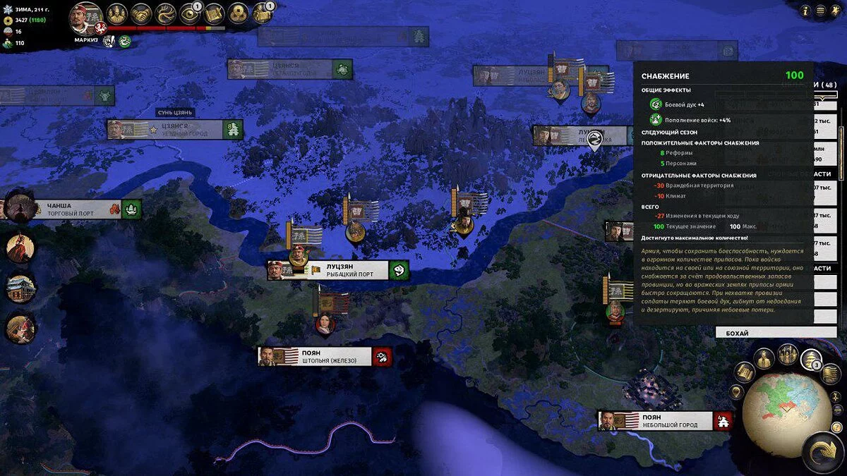 Истощение. Истощение — это негативный эффект, вызывающий периодический урон по отрядам истощённой армии, а также понижающий их мораль и боевую эффективность. Главный фактор, вызывающий истощение — нехватка припасов. Пополнить их можно, вернув армию на свою или союзную территорию, желательно туда, где нет проблем с продовольствием. В панели армии количество припасов указывает специальная шкала.