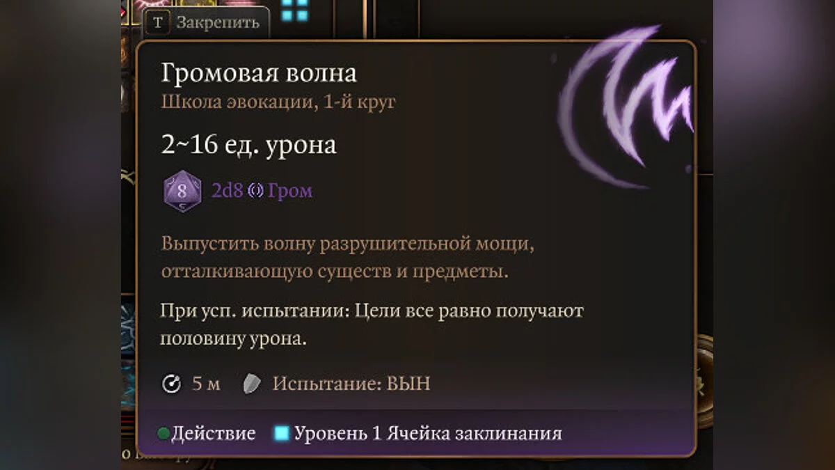 «1d8 + 3» — это обозначение того, как игра будет высчитывать урон, который вы нанесли попаданием по врагу. В тот момент, когда вы атакуете гоблина, игра за вас кидает кубик и смотрит на результат. «1d8» означает, что она кинет 1 кубик с восемью гранями (d8), а после прибавит к результату 3 единицы урона. Вот и всё. Первое число в «1d8» — количество бросаемых кубиков. Второе — максимальный показатель, который может выпасть на оружии. При ударе громовой волной вы наносите «2d8» урона, кидая два восьмигранных кубика и складывая их значения.