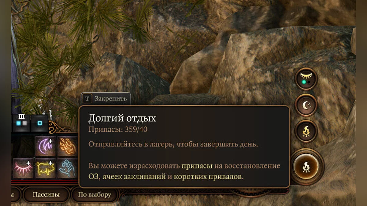 Чтобы восстановить ячейки заклинаний и некоторые навыки, необходимо время от времени отдыхать. Не забывайте про эту опцию и делайте передышку, если не хотите тратить зелья или заклинания на лечение отряда.