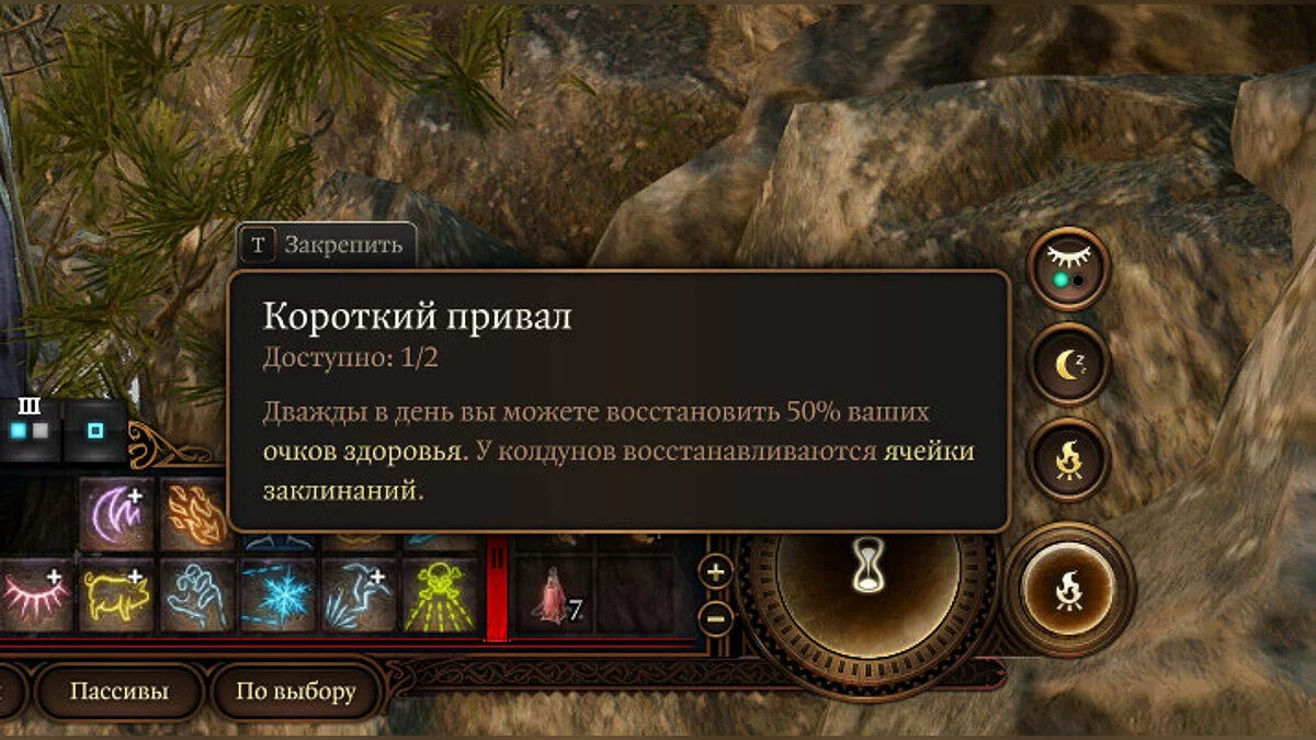 Короткий привал восстанавливает часть здоровья (примерно половину), ячейки заклинаний у чернокнижников и некоторые способности. Сделать такой привал можно два раза без затрат провизии.