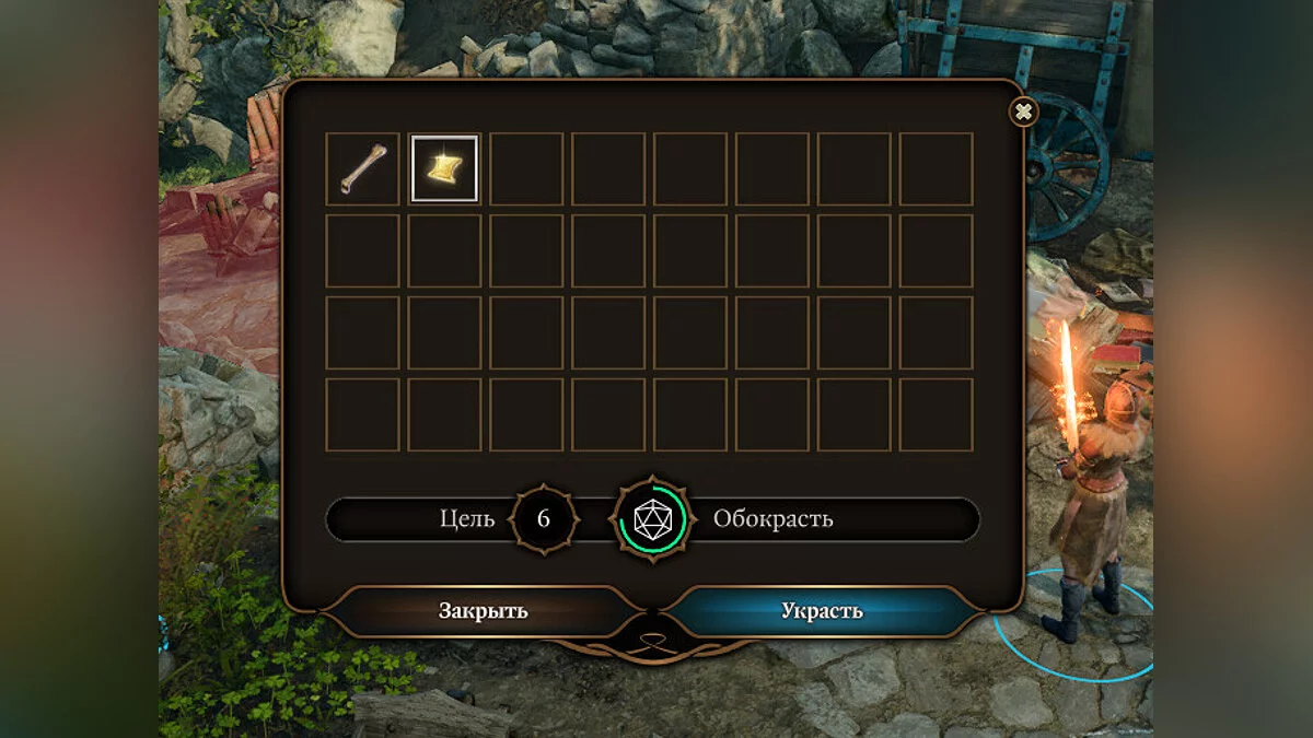Успех кражи зависит от ловкости персонажа и значения навыка «Ловкость рук». Выберите предмет, который хотите украсть. Значение, которое должно выпасть на кубике, будет указано правее поля «Цель». Нажмите на значок кубика, чтобы сделать проверку на успешность кражи и украсть предмет. Если вы провалитесь, NPC заметит это и начнётся бой. Сложность кражи зависит от размера и ценности предмета.