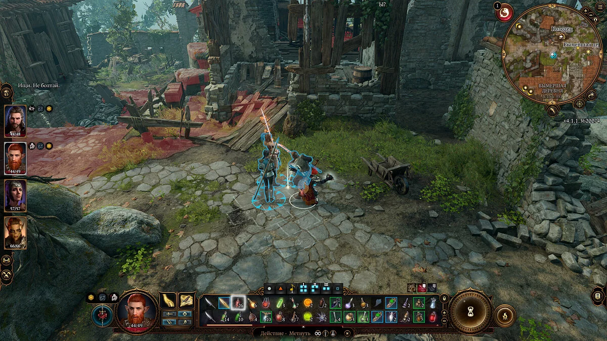 Интерфейс пусть и выглядит перегруженным, но на деле достаточно удобно сортирует все действия по требуемым затратам. Переключаясь между вкладками и наводя на действия, приемы и заклинания, вы можете увидеть, что конкретно требует тот или иной приём. Так, при игре за барда, вооруженного двумя одноручным арбалетами, вы можете отойти от врага (движение), выстрелить в одного противника (дополнительное действие), а затем применить заклинание (основное действие).