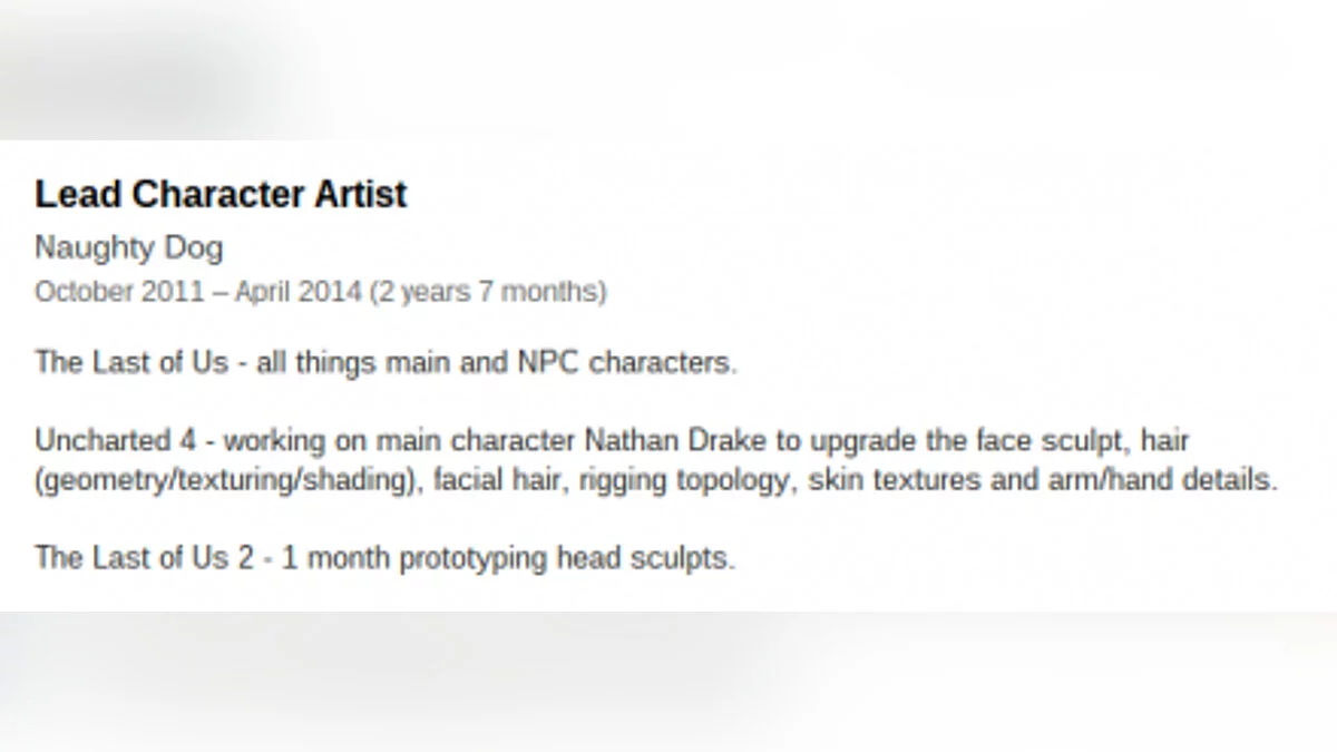 Обратите внимание на последнюю строчку. Согласно ей Ноуланд должен был придумать лица главных персонажей для прототипа будущей The Last of Us 2. Занимался этим он не долго — с марта по апрель 2014 года, то есть всего месяц, но главное ведь сам факт. Теперь слухи о существовании The Last of Us 2 подтверждаются — Naughty Dog работает над прототипом подобного проекта, хоть и нет гарантий, что он когда-либо увидит свет.