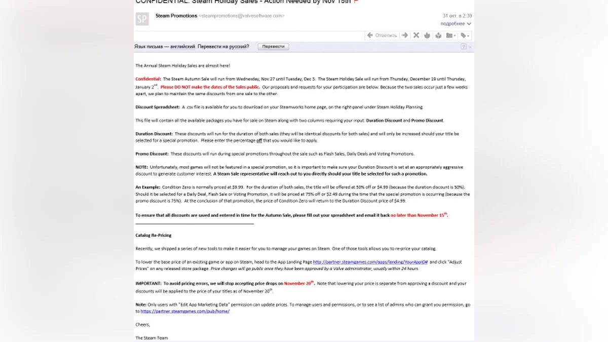 Русский разработчик, чья игра прошла Steam Greenlight, начал распространять информацию о начале осенней и новогодней распродажах в Steam, которую ему доверила Valve.