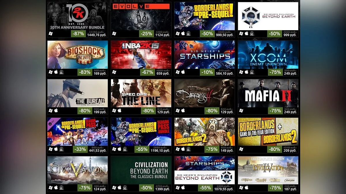 Скидки достигают 80 %, Borderlands 2 можно отхватить за 149 рублей, а Civilization 5 — за 124. Кроме игр серии Civilization, можно также порадовать себя другими проектами Сида Мейера — недавней Starships, а также Pirates! и Railroads!.