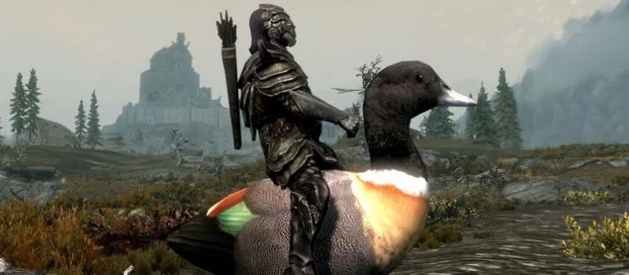 Новости 31 мая 2018Сообщество моддеров очень активно поддерживает ролевой экшен The Elder Scrolls 5: Skyrim уже на протяжении нескольких лет. Иногда моддеры создают нечто удивительно, а в некоторых ситуациях просто хотят развлечь геймеров чем-то необычным. Недавно для игры выпустили модификацию Ducks and Co. Mounts and Followers, которая добавляет в игру новых маунтов (существ для передвижения).