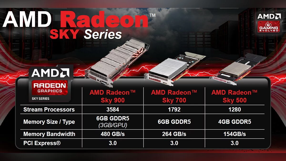 • Radeon Sky 500, обладающий «всего лишь» 1280 потоковыми процессорами и 4 ГБ GDDR5-памяти.