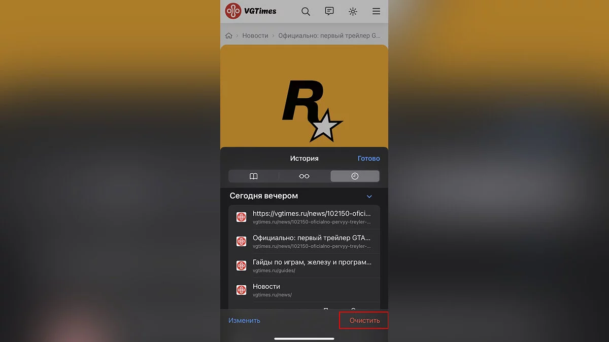 Заходим в браузер, нажимаем на иконку книжечки в нижней части экрана. Откроется история посещения последних страниц. Просто нажмите «Очистить».