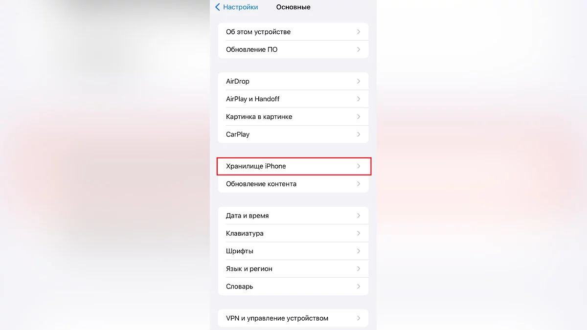 Первым делом нам нужно открыть настройки смартфона и попасть в раздел «Основные». Там находим «Хранилище iPhone». В «Хранилище» вам доступно полное отображение того, как вы используете память своего устройства, и ниже — все приложения и то, сколько места они занимают.