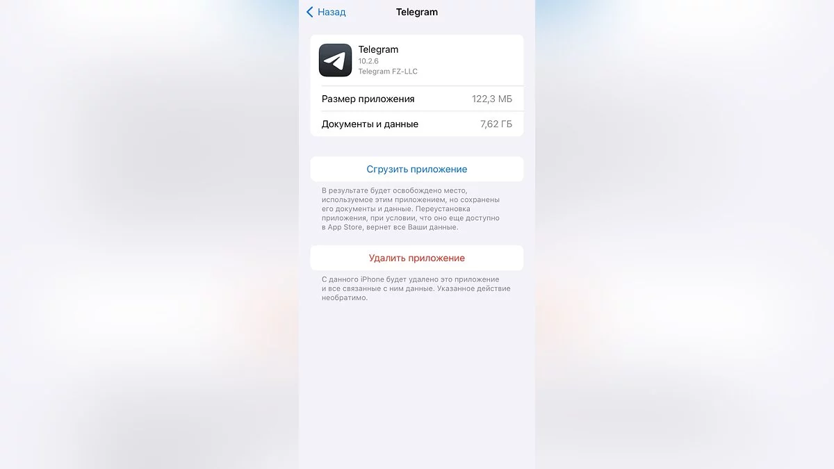 Для того чтобы сгрузить приложение, нужно нажать на него, а после — на кнопку «Сгрузить приложение». Таким образом, вы можете не бояться за приложения с ценными данными и просто установить его, когда оно станет вам снова необходимо, а место в нужный момент освободится.