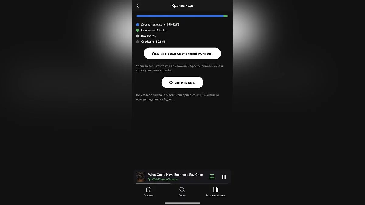 Spotify, в отличие от других приложений, разделяет кэш и загруженную музыку. Таким образом, вы можете очистить ненужные файлы, освободив значительную часть памяти, при этом не прибегая к удалению библиотеки.