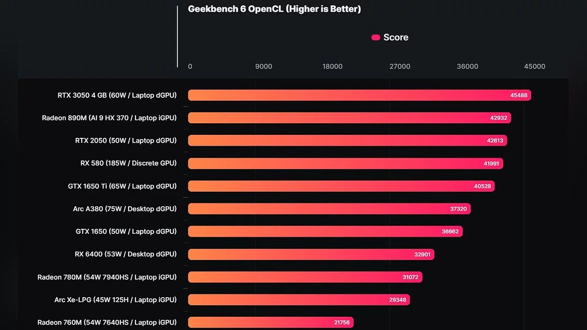 Согласно отчету, Radeon 890M набрала 42 932 балла в тесте OpenCL, что превосходит результаты Radeon RX 580 (41 991 балл) и Radeon RX 5500 (42 923 балла). Производительность близка к GTX 1650 Ti (44 708 баллов) и GTX 1070 (45 011 баллов). В тесте Vulkan Radeon 890M набрала 46 298 баллов, практически совпав с результатом GTX 1070 (46 299 баллов) и превзойдя GTX 1650 Ti (40 613 баллов). Результаты тестирования показывают, что производительность Vulkan у Radeon 890M на 35,4% выше, чем у Intel Arc A140V.