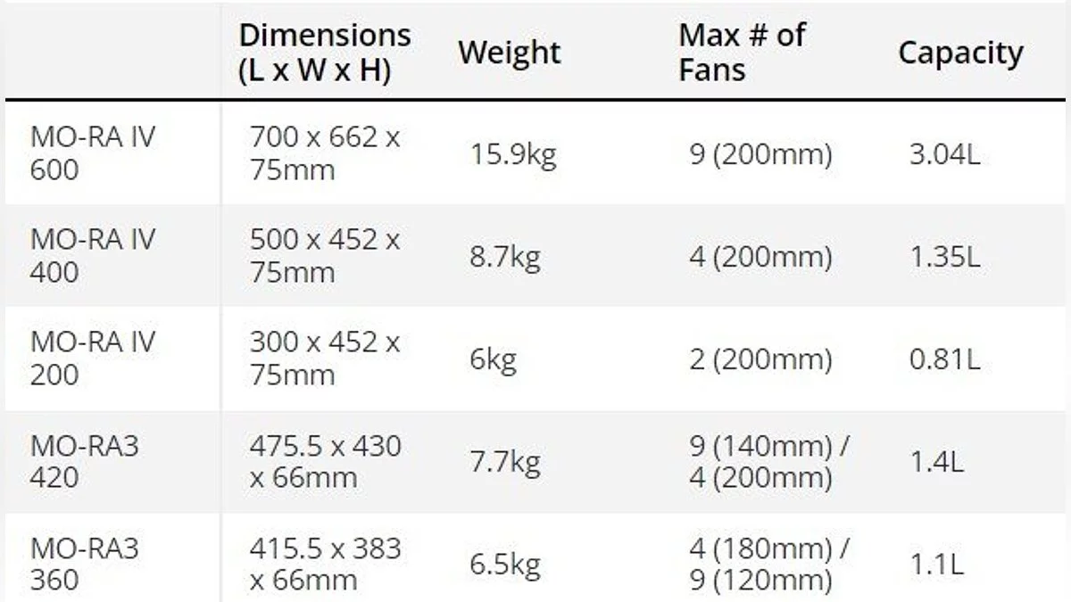 В серию вошли три модели: MO-RA IV 200, MO-RA IV 400 и MO-RA IV 600, доступные в белом и черном цветах. Все радиаторы имеют толщину 75 мм и поддерживают установку вентиляторов размером 200 мм. MO-RA IV 200 может вместить два вентилятора, MO-RA IV 400 — до четырёх, а MO-RA IV 600 — до девяти. Радиаторы обладают модульной конструкцией, что позволяет устанавливать их практически в любом месте: в больших корпусах, отдельно стоящими или на стене.