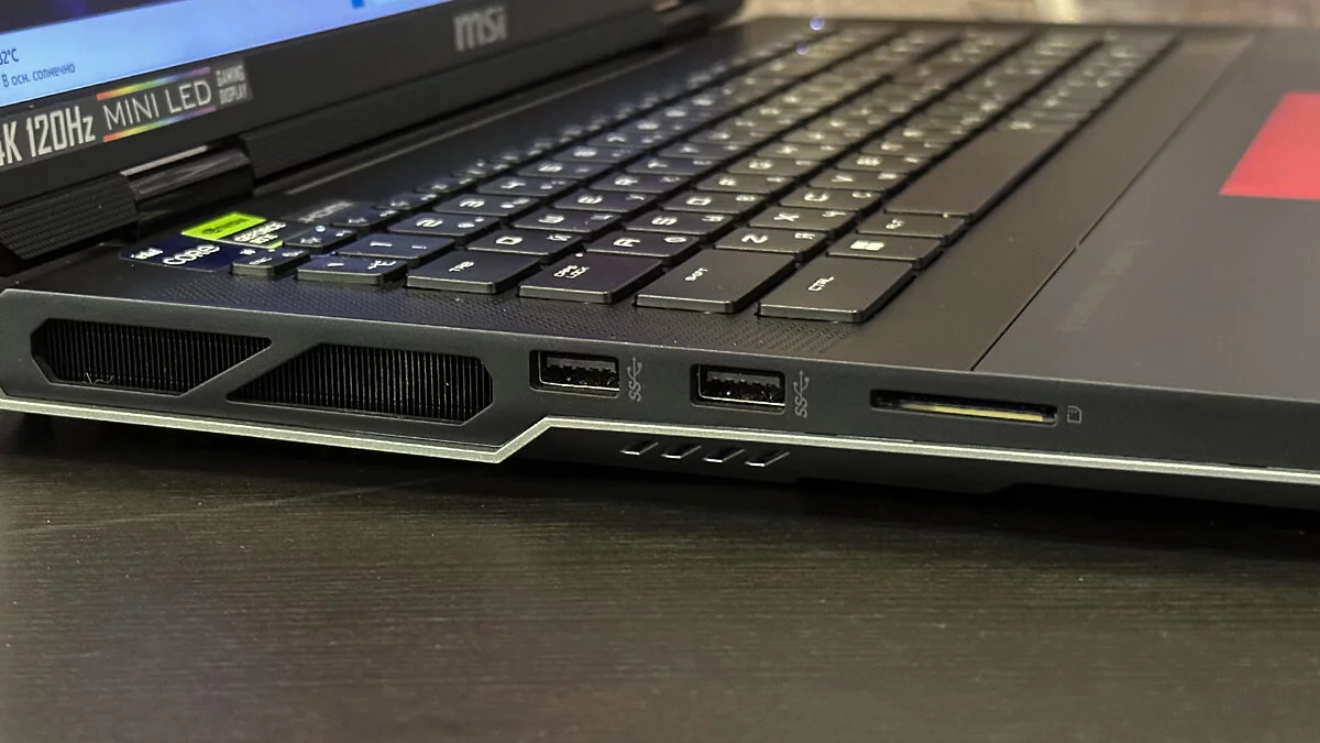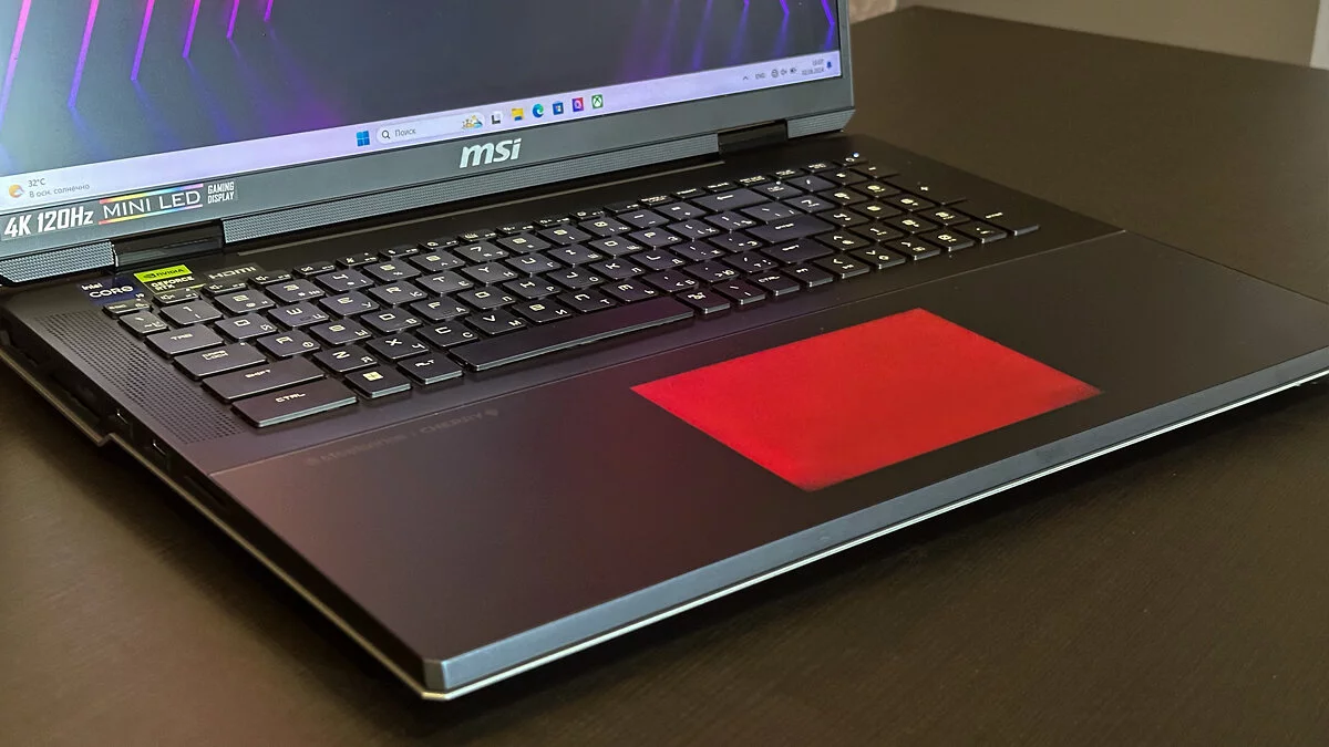 Такого большого лэптопа на наших обзорах ещё не было: MSI Titan 18HX A14VIG оснащён 18-дюймовым дисплеем Mini-LED с разрешением 3840x2400 и поддержкой HDR. Таким образом экран у модели не только большой, но и достаточно яркий — сертификация VESA DisplayHDR заявляет о яркости в 1000 и больше нит.