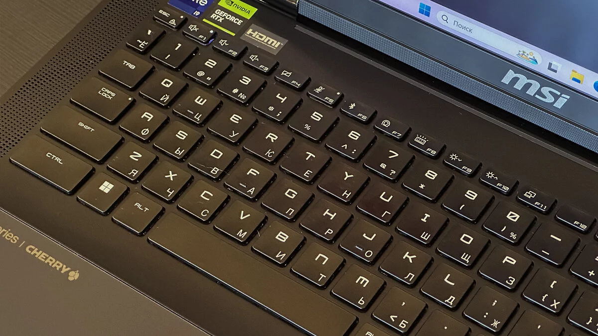 Сам корпус модели выполнен из магний-алюминиевого сплава, а RGB-тачпад и место под кисти скрыты под матовым стеклом. Отдельно отметим клавиатуру с низкопрофильными механическими переключателями Cherry MX Ultra Low Profile. Если вы привыкли к мембранным клавишам, которыми оснащено большинство ноутбуков, первое время звук и тактильность этих переключателей может отпугнуть. Но спустя некоторое время, совершенно забываешь об их звонкости и привыкаешь к качественному отклику. Также стоит отметить, что мембранный блок здесь тоже есть: например, цифровой блок и стрелки нажимаются тише и мягче. По традиции, любая подсветка, включая поклавишную, легко настраивается в приложении MSI Center.