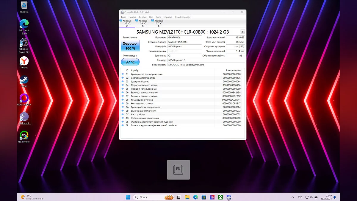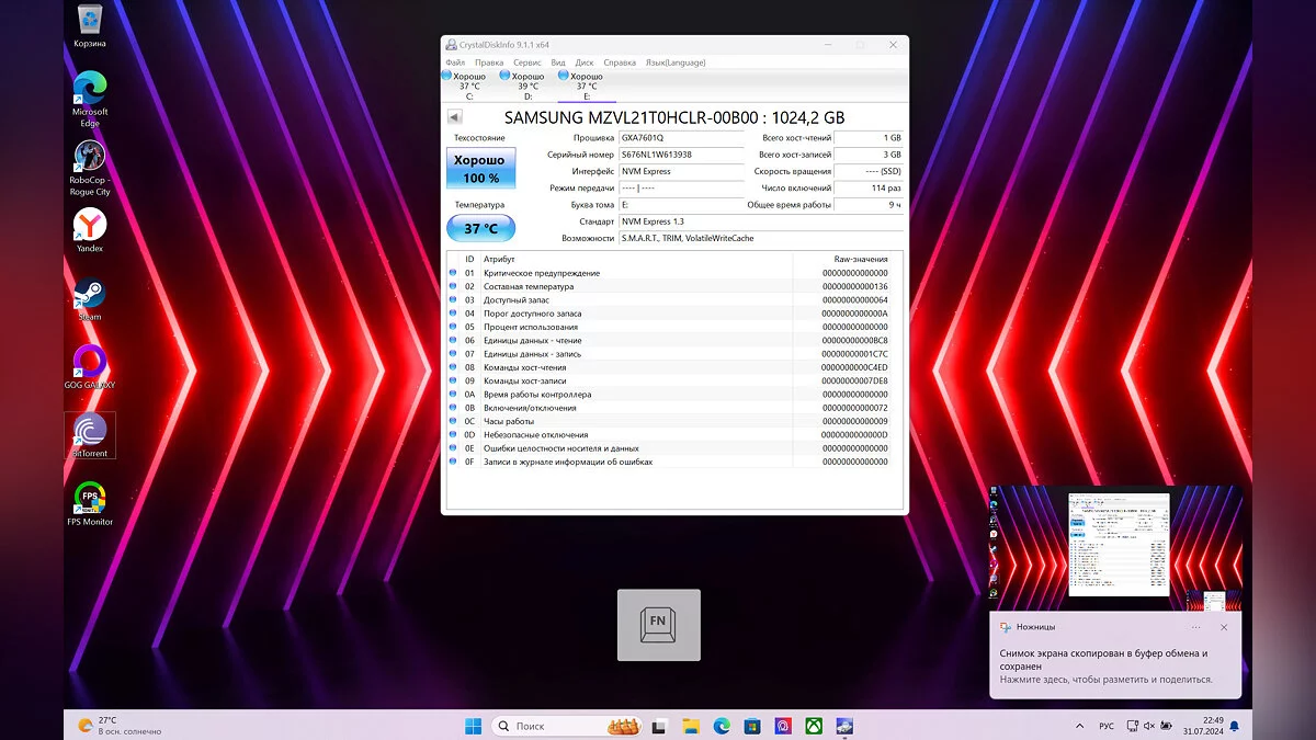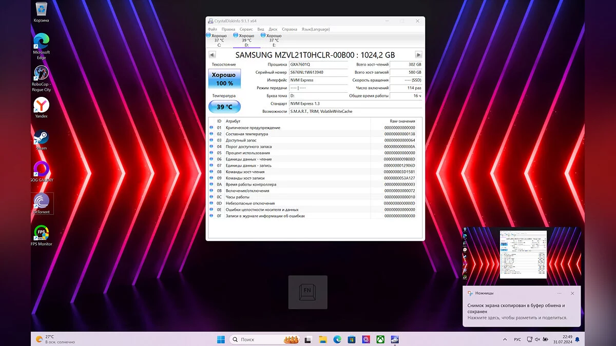 Температура процессора Intel Core i9 14900HX с теплопакетом до 95 Вт всё же показывала высокие значения, но стоит отметить, что тесты проводились летом, при комнатной температуре около 30 градусов.