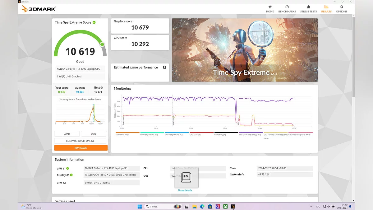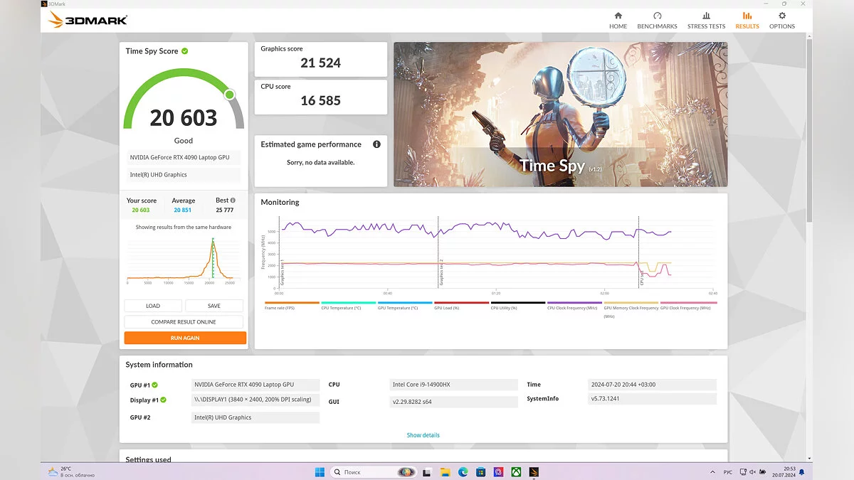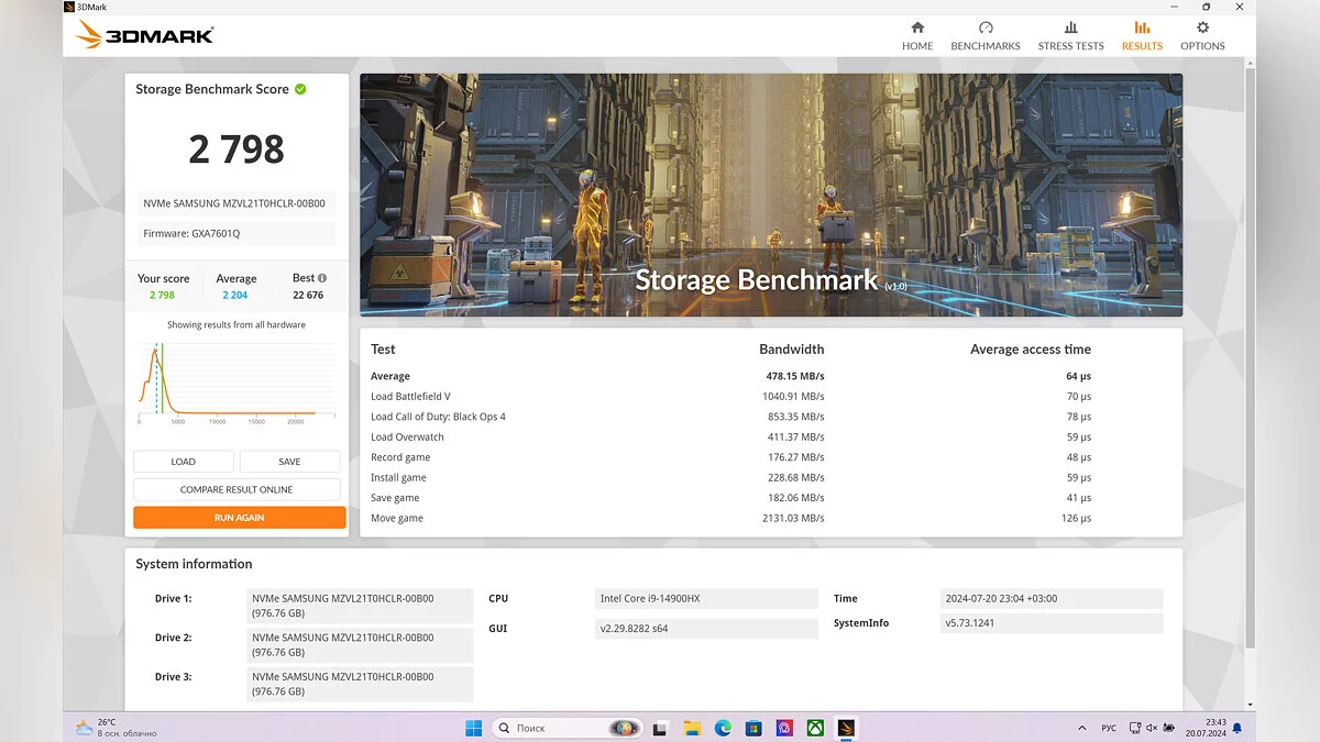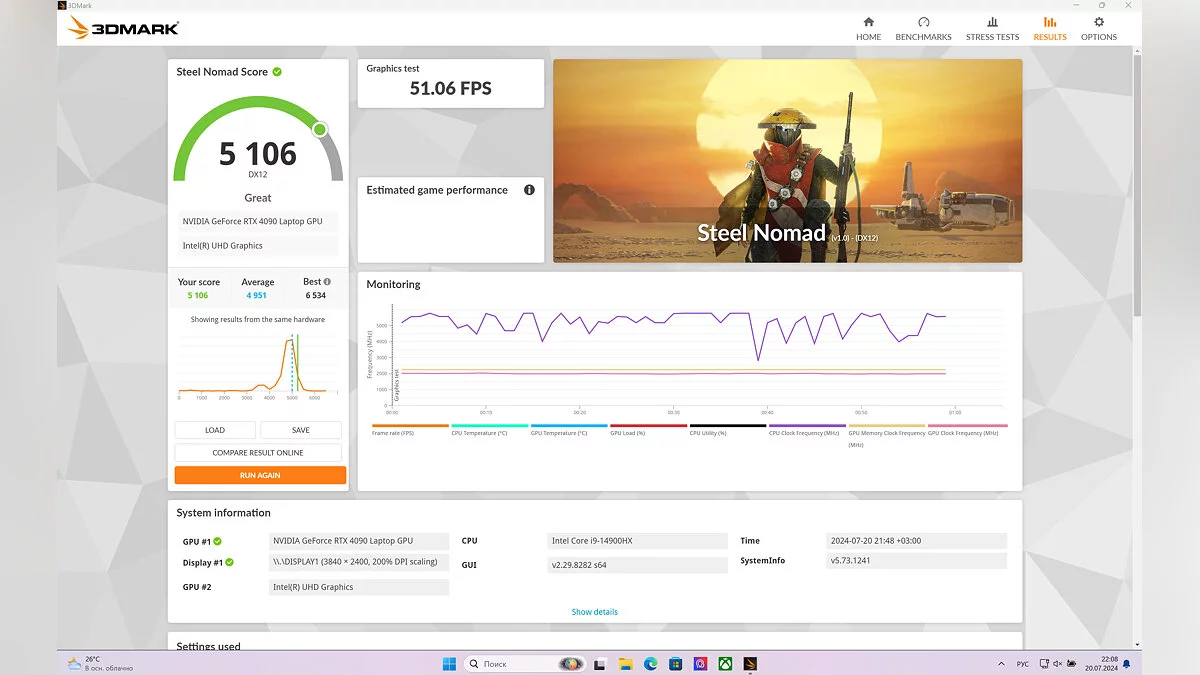 Также мы оценили мощность ноутбука в 3DMark: в тестах Time Spy, Time Spy Extreme, Steel Nomad, CPU Profile и Storage Benchmark для проверки скорости загрузки игр на SSD.