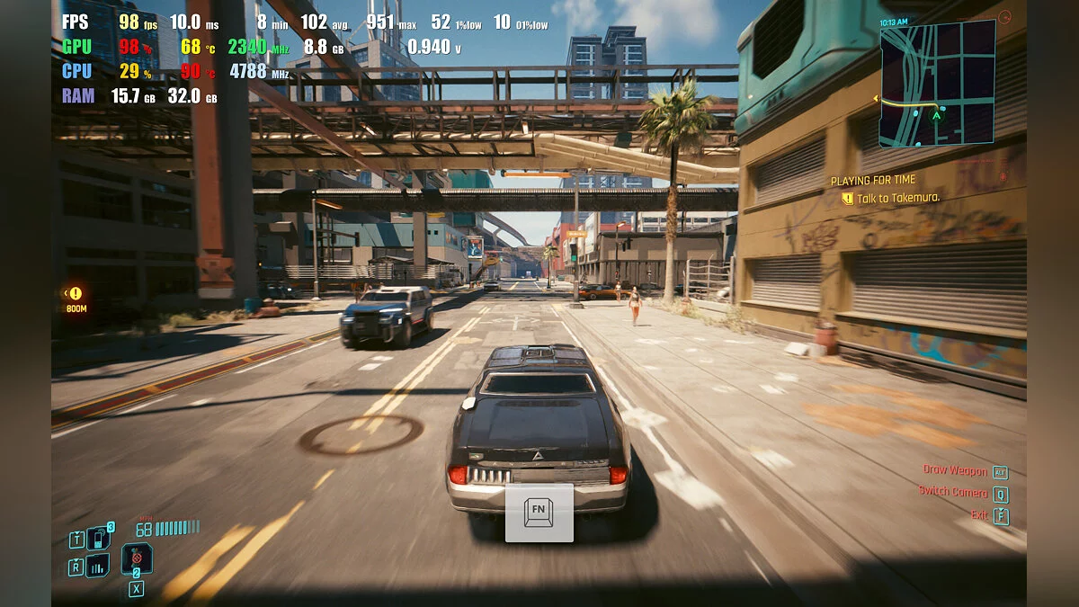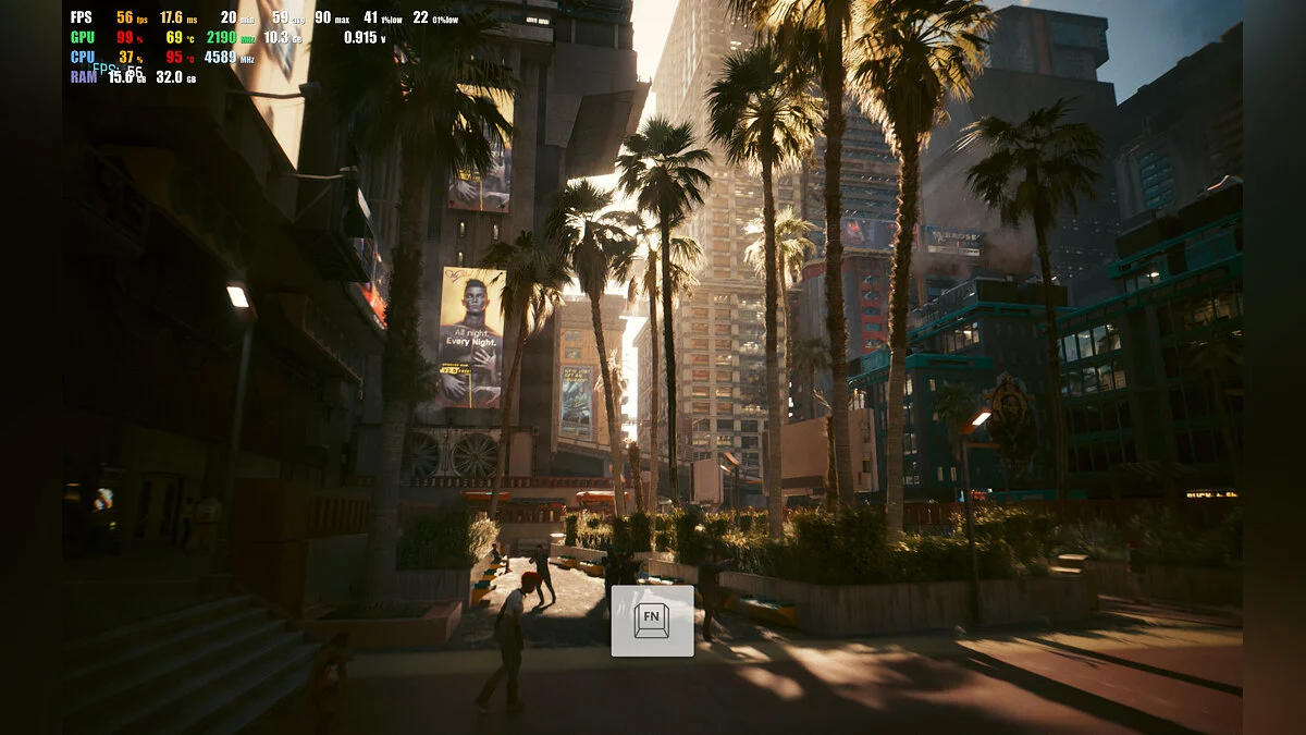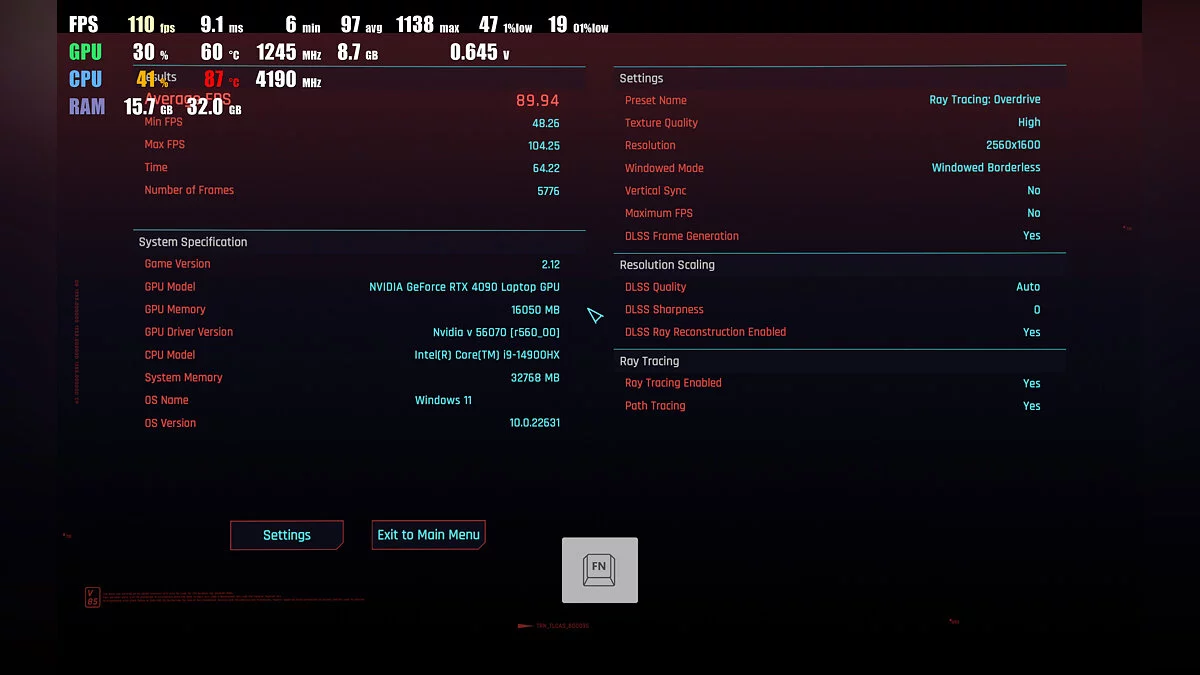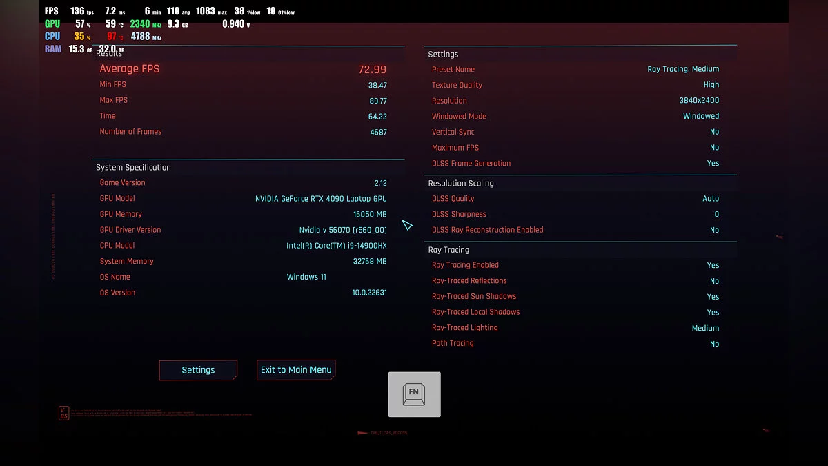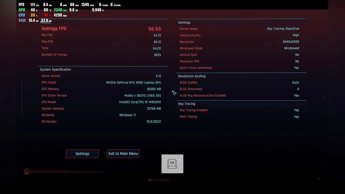 Cyberpunk 2077. Встроенный бенчмарк показал средние 56 кадров в секунду при разрешении экрана 3840x2400.