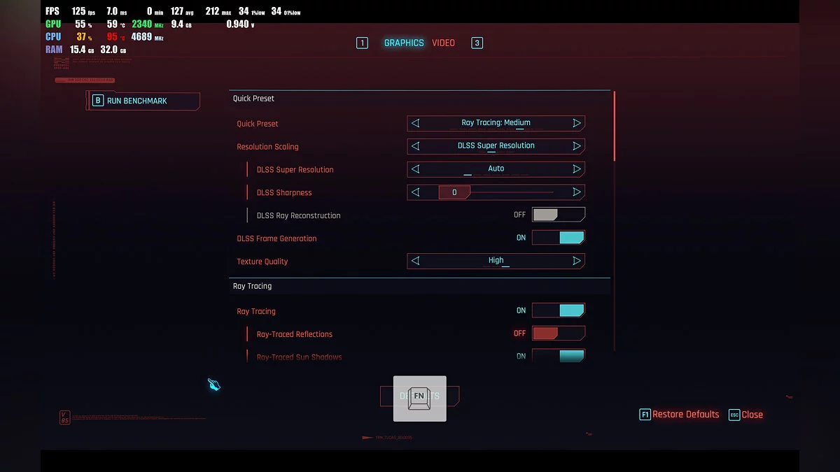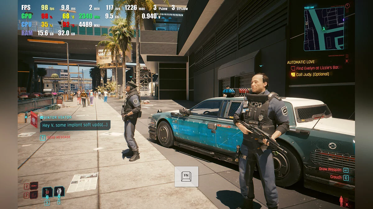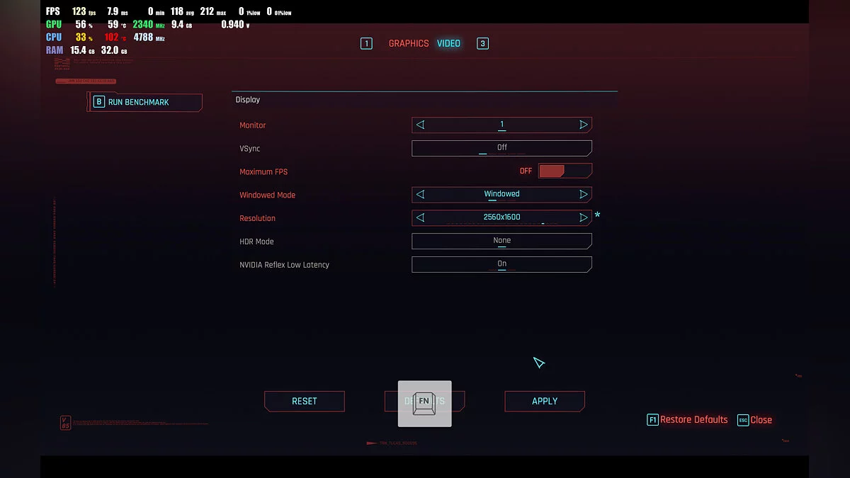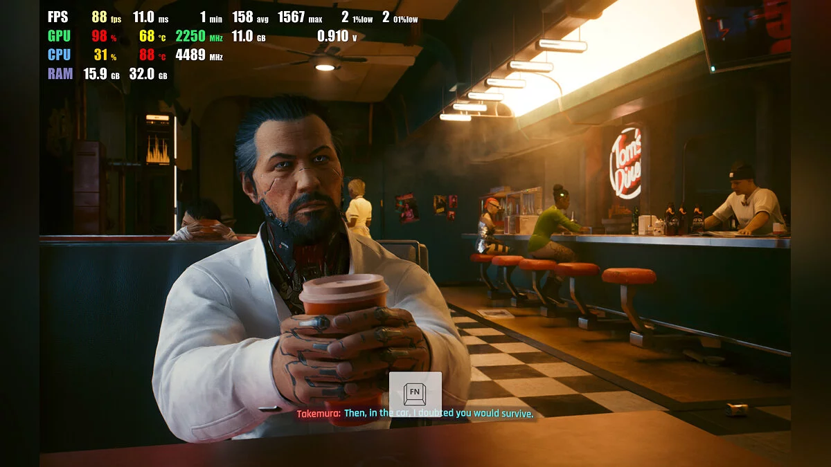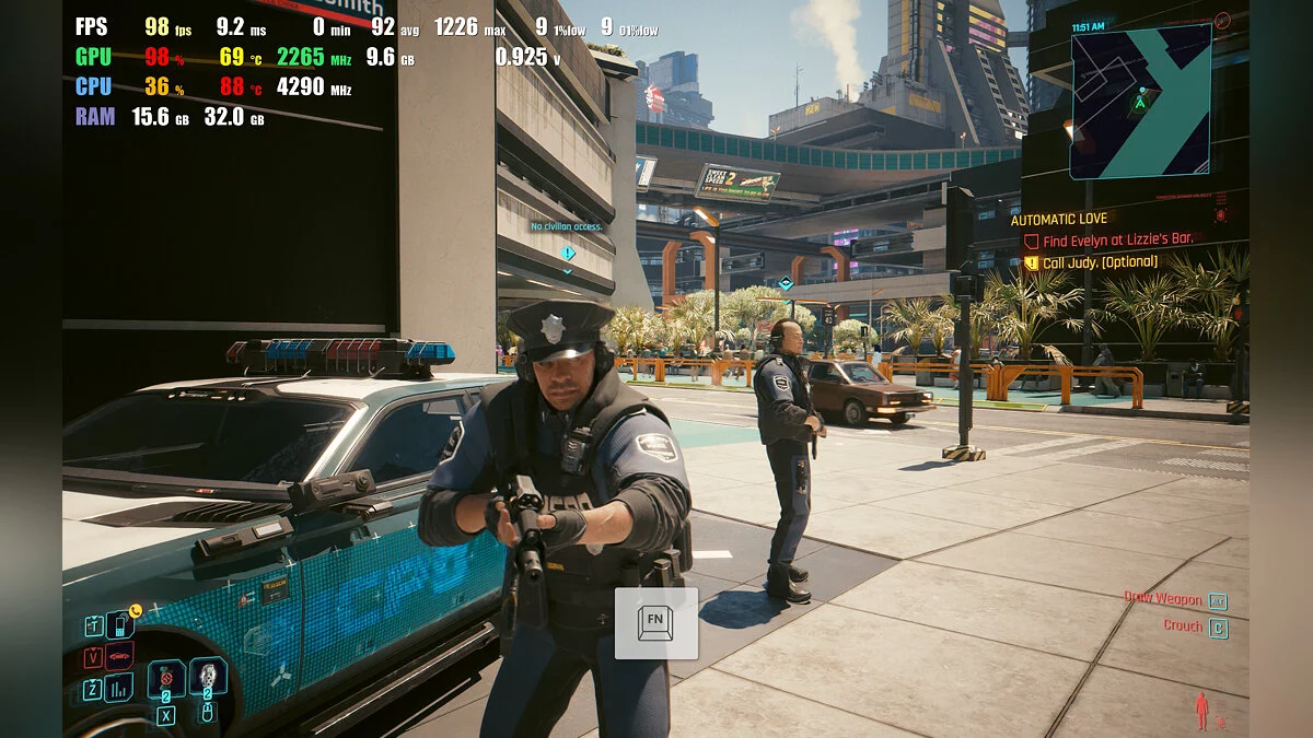 Cyberpunk 2077. Встроенный бенчмарк показал средние 56 кадров в секунду при разрешении экрана 3840x2400.