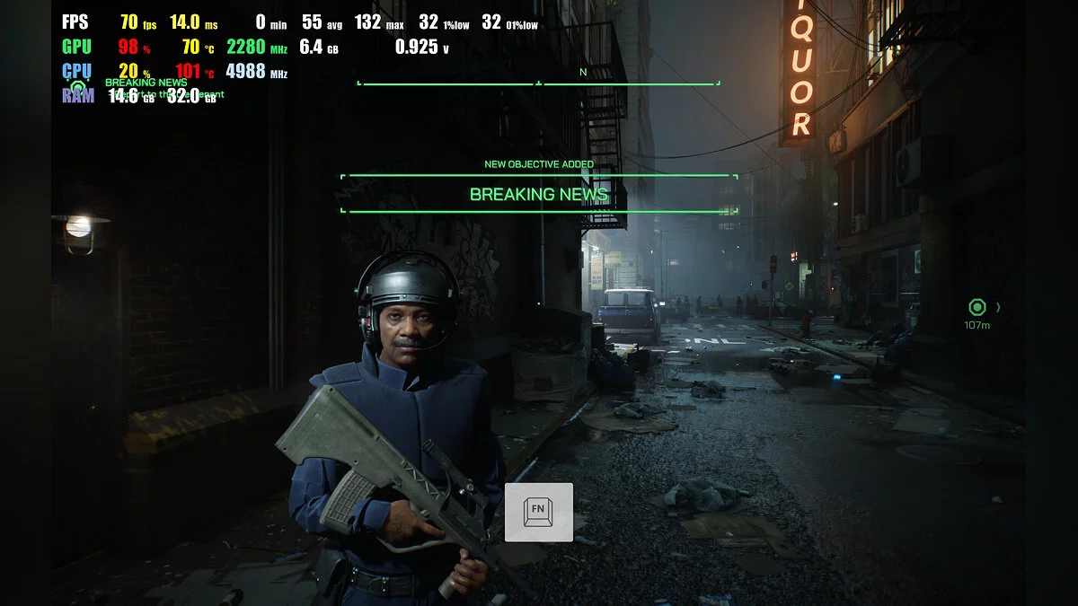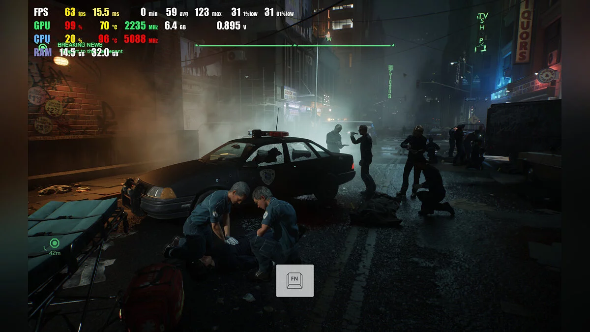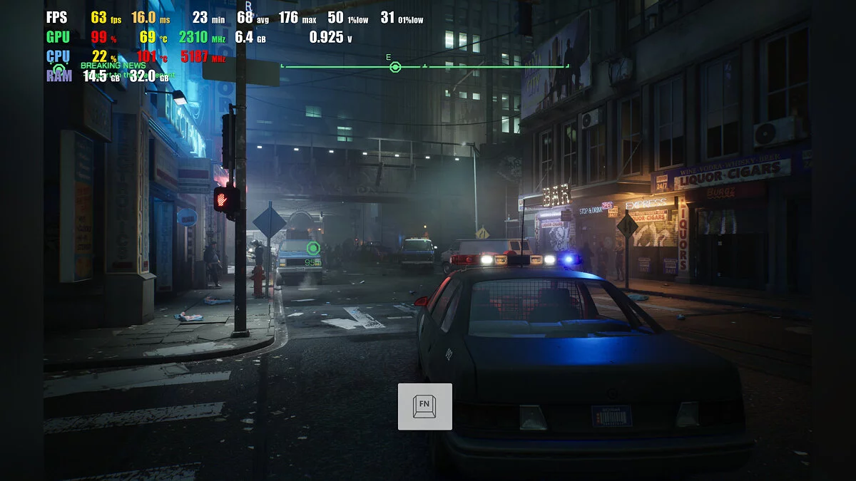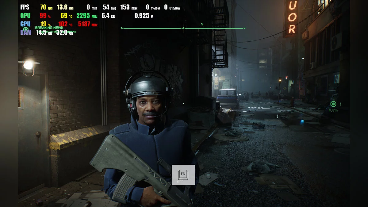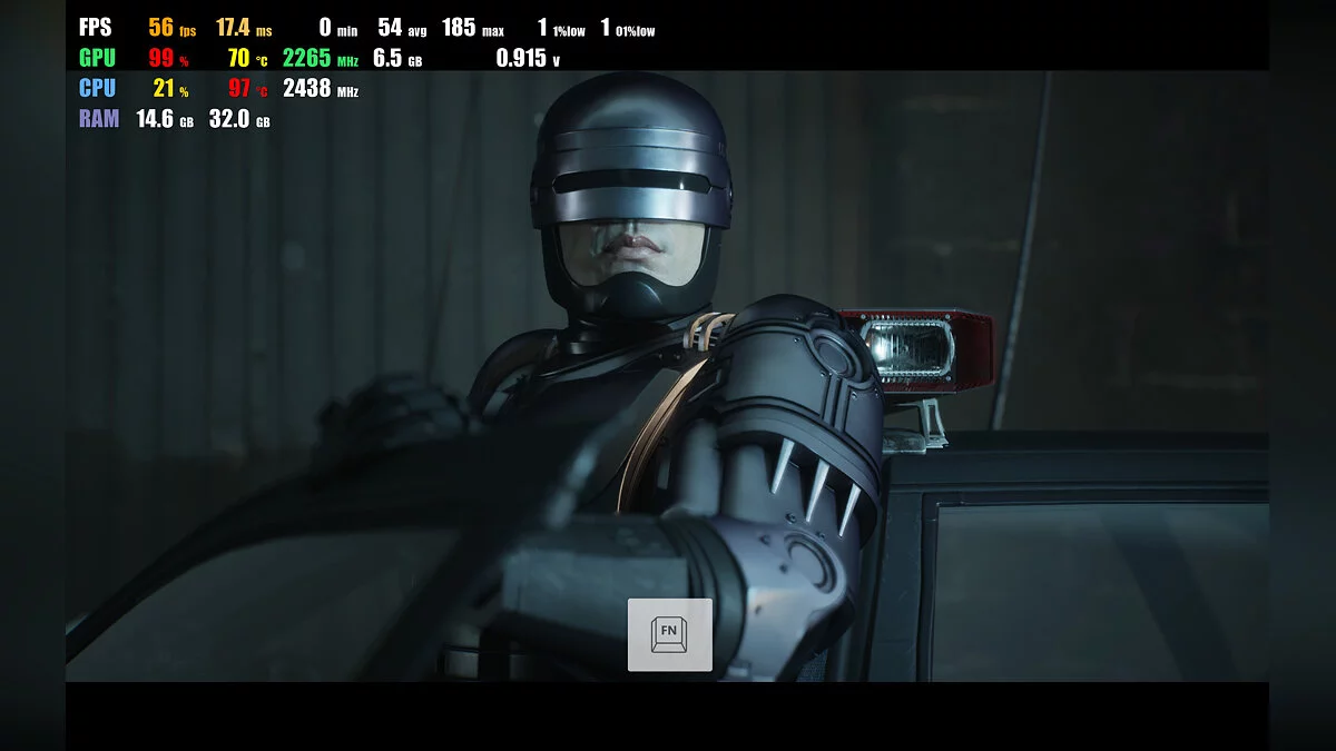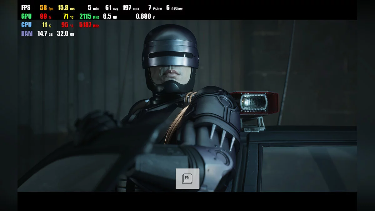 RoboCop: Rogue City. Тесты показали отсутствие буста частоты кадров в зависимости от смены разрешения. Все ультра-настройки и полная трассировка — 65-75 FPS.