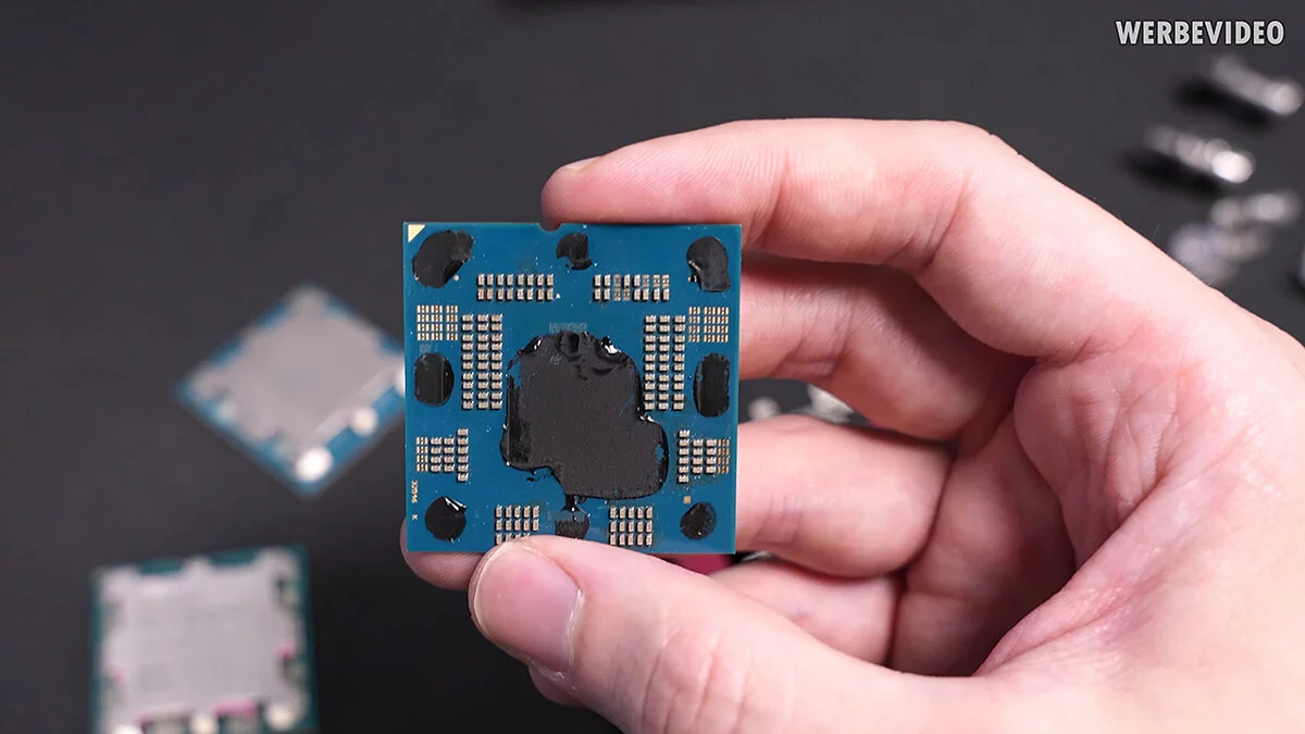 Еще одно различие состоит в том, что подделка оказалась тоньше оригинала и имеет немного другой цвет печатной платы. Также в фейковой версии процессора отсутствует защитное покрытие на конденсаторах, но компоновка при этом та же. К тому же клея на них нет, в отличие от настоящего AMD Ryzen 7 7800X3D.