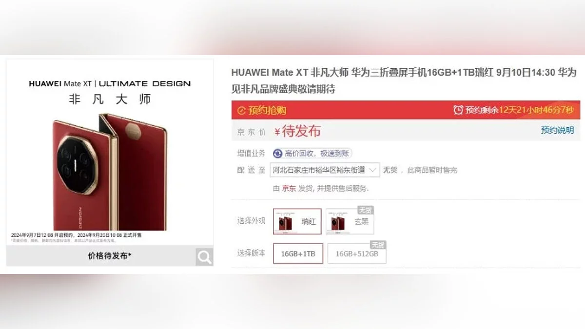 Некоторые площадки уже открыли предзаказы на новинку HUAWEI Mate XT Ultimate Design. Необычный смартфон с тремя экранами поступит в продажу в Китае 20 сентября в двух видах комплектации.