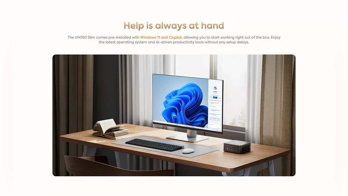 Устройство поставляется в конфигурации 16 Гб / 1 ТБ, но поддерживает DDR5 с объемом памяти до 96 Гб. Размер хранилища также можно увеличить до четырех терабайт. Работает мини-ПК на уже предустановленной Windows 11 с Copilot.