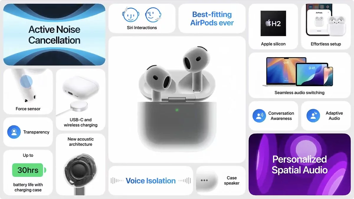 AirPods 4 получили новую форму, чип H2, улучшенные динамики и микрофон, а также возможность принимать звонки кивком головы. Устройство может работать до 30 часов без подзарядки. Обычная версия будет стоить 130 долларов, а версия с шумодавом — 170 долларов. Наушники AirPods Max с разъёмом Type-C и улучшенной системой подавления шума оценили в 550 долларов.