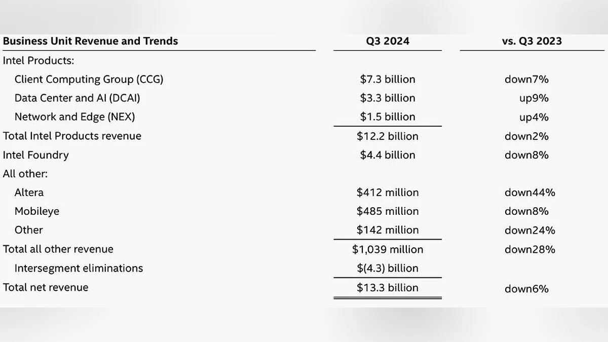 За этот же период выручка Intel достигла примерно 13,3 миллиарда долларов, что оказалось выше прогнозов. Однако даже такая сумма не смогла покрыть солидную дыру в финансах. Сообщается, что валовая прибыль упала до 15%, что стало историческим минимумом для компании.