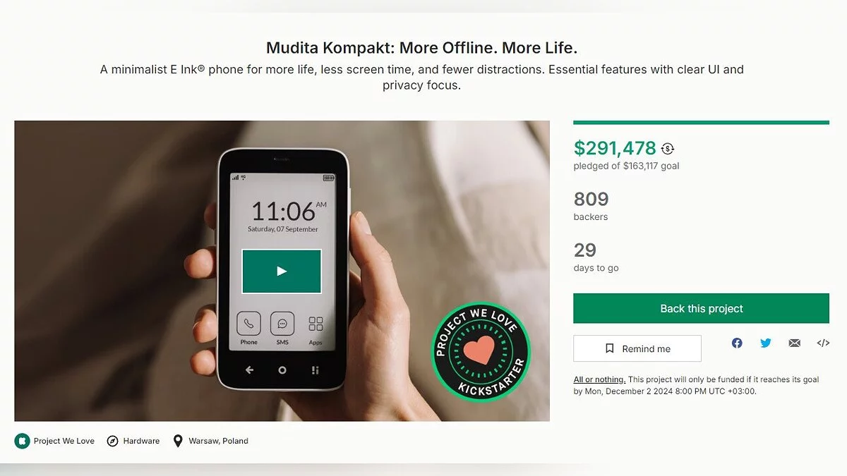 Компания Mudita, созданная сооснователем CD Projekt RED Михалом Кичиньски ((Michal Kiciński), представила на Kickstarter очередную любопытную разработку. На этот раз ею стал «философский» мини-смартфон, который призван обеспечить конфиденциальность.