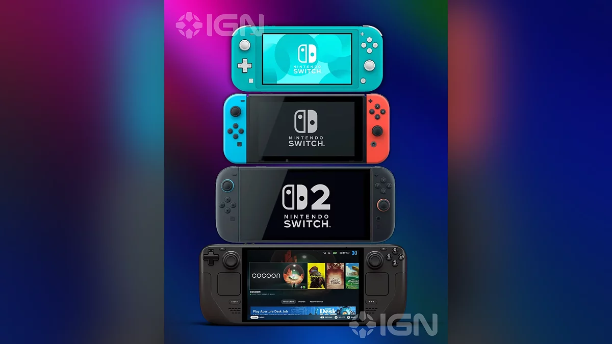 Издание IGN, в свою очередь, тоже опубликовало сравнительную картинку, на которой представлены консоли Switch Lite (208 мм x 91 мм), Switch (239 мм x 102 мм), Switch 2 (265 мм x 115 мм) и Steam Deck (298 мм x 117 мм).