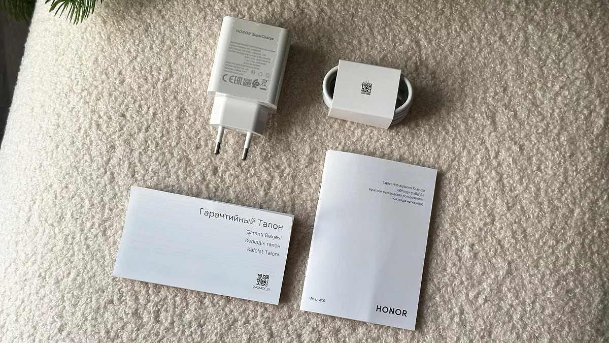 Гаджет поставляется в белой коробке с изображением планшета. Внутри — устройство с кабелем и зарядкой на 35 Вт.
