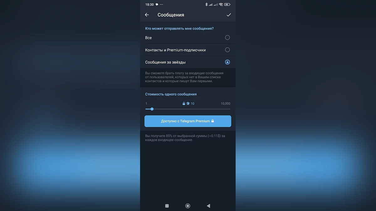 Новая функция доступна для подписчиков Premium. Пользователь может скрыть свою «личку» от непрошенных гостей, выставив определённую сумму за каждое сообщение. В качестве оплаты служат «звёзды» — внутренняя валюта мессенджера. То же самое можно настроить и для комментариев в группах по желанию владельца чата. Включить функцию можно в «Настройках» в разделе «Конфиденциальность».