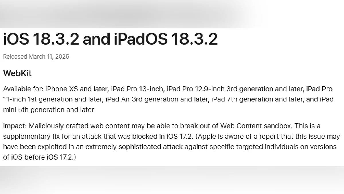 Уязвимость CVE-2025-24201 в WebKit, движке для Safari и других веб-браузеров, позволяла злоумышленникам перенаправлять пользователей на сайты с вредоносным ПО. Как заявила Apple в примечаниях к патчноуту, лазейку использовали для атаки против определённых лиц, использовавших версию iOS 17.2. В связи с этим компания попросила пользователей скачать свежие обновления для планшетов и iPhone, а также Mac.