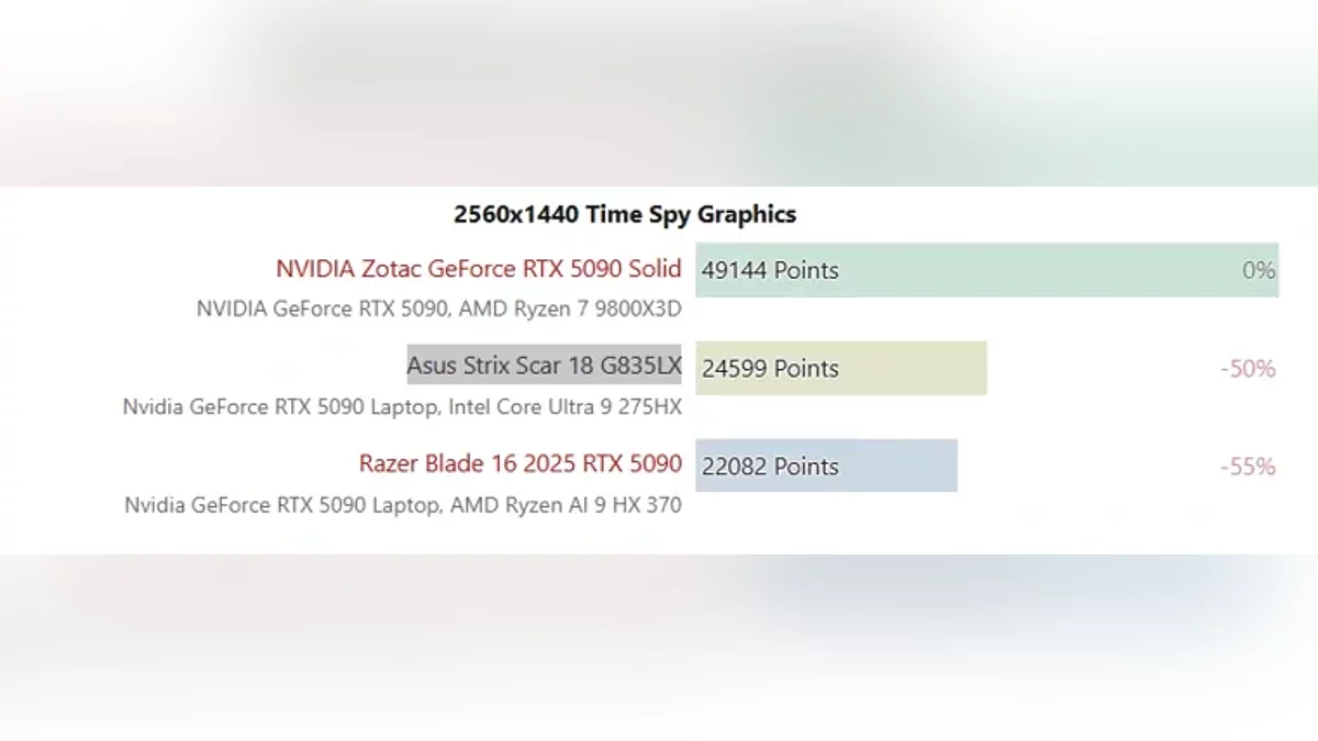 - В 3DMark Time Spy разрыв достигает 50% (49 144 vs 24 599 баллов), а в тесте Port Royal мобильный GPU отстаёт на 60% (37 524 vs 15 433 балла).