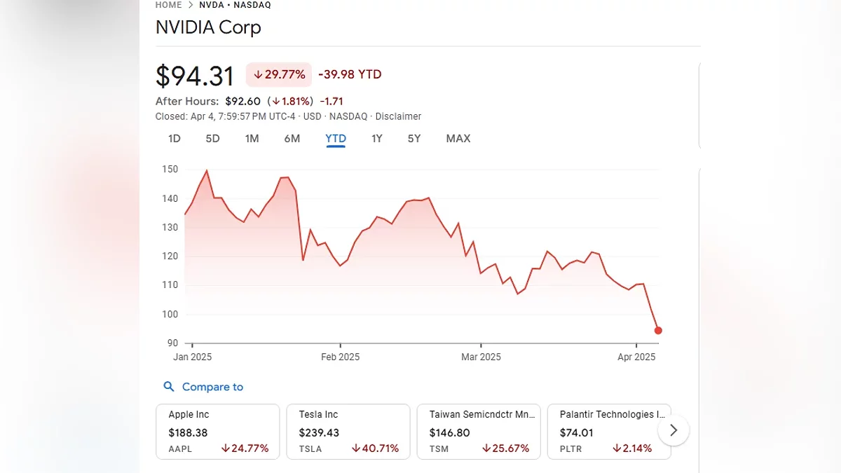 Не последнюю роль в происходящем сыграли недавние пошлины против зарубежных производителей, введённые президентом США Дональдом Трампом (Donald Trump) 2 апреля. Акции NVIDIA отреагировали болезненно, разом потеряв 7,3% на фоне новых тарифов. Следом за ним рухнула стоимость ценных бумаг других лидеров технологического рынка, включая Tesla и Apple — на 10% и 7% соответственно.