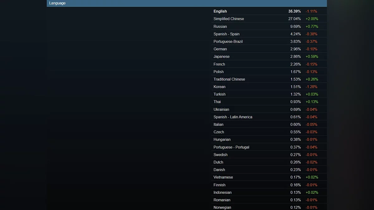 Самым популярным языком вновь стал английский — 35,39%. Но его доля сократилась в апреле на 1,11%. После него идут упрощенный китайский (27,04%) и русский (9,69%).