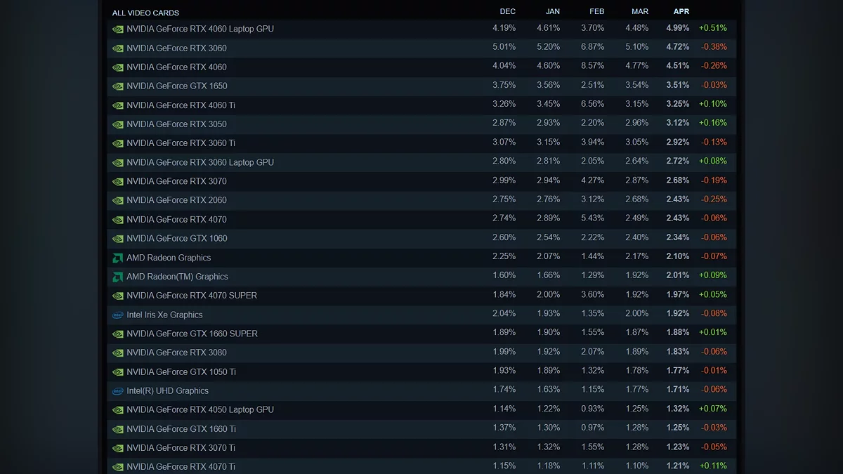 На этот раз на первом месте среди «народных» видеокарт лэптоп-версия NVIDIA GeForce RTX 4060. На нее приходится 4,99% пользователей. Следом идут NVIDIA GeForce RTX 3060 (4,72%) и десктопная NVIDIA GeForce RTX 4060 (4,51%).