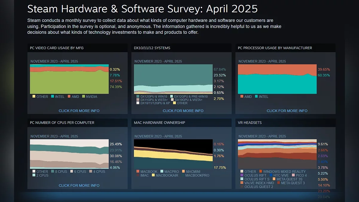 В Steam подвели итоги апрельского опроса среди пользователей этого сервиса. Благодаря этому стало известно, какие в основном видеокарты используют геймеры. По словам Valve, собранная информация помогает понять, какие технологии следует развивать и какие продукты предлагать пользователям.