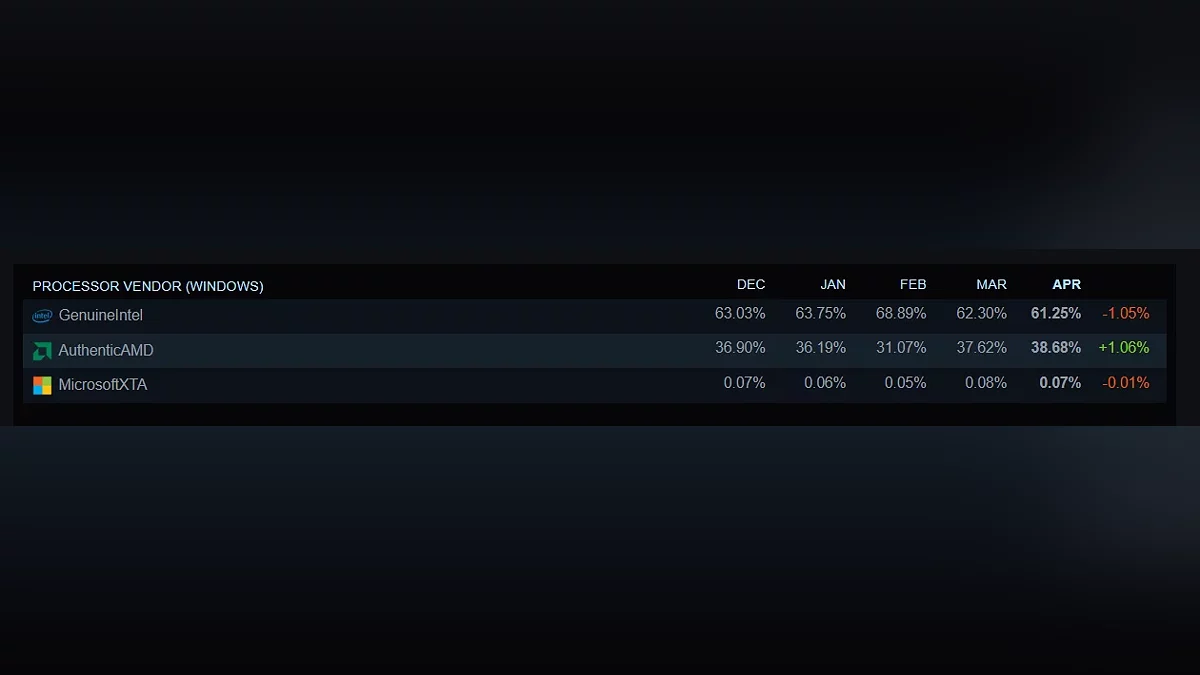 Среди процессоров лидерство снова у Intel. Однако доля AMD в апреле выросла на 1,06% и сейчас составляет 38,68% (против 61,25% у Intel).