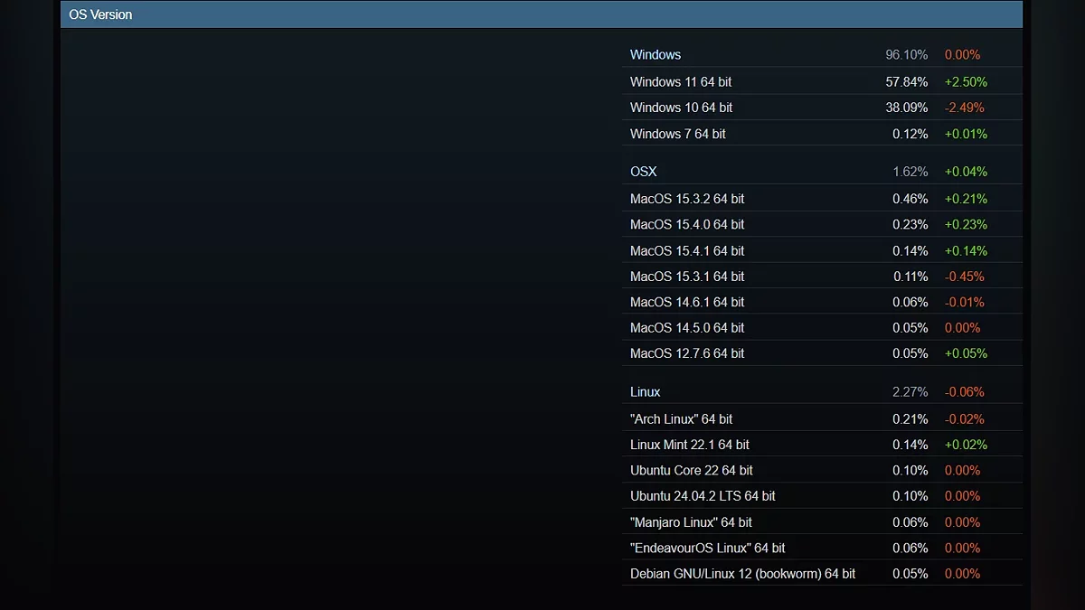 Windows 11 64 bit увеличила свою долю среди пользователей Steam на 2,50% (57,84% в целом). Windows 10 64 bit используют 38,09% геймеров, а Windows 7 64 bit — 0,12%.