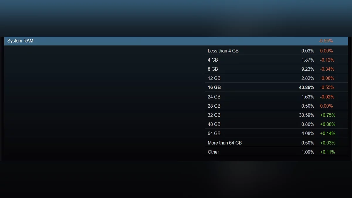 Что касается ОЗУ, то у 43,86% пользователей установлено на ПК 16 ГБ оперативной памяти. 32 ГБ используют 33,59%.