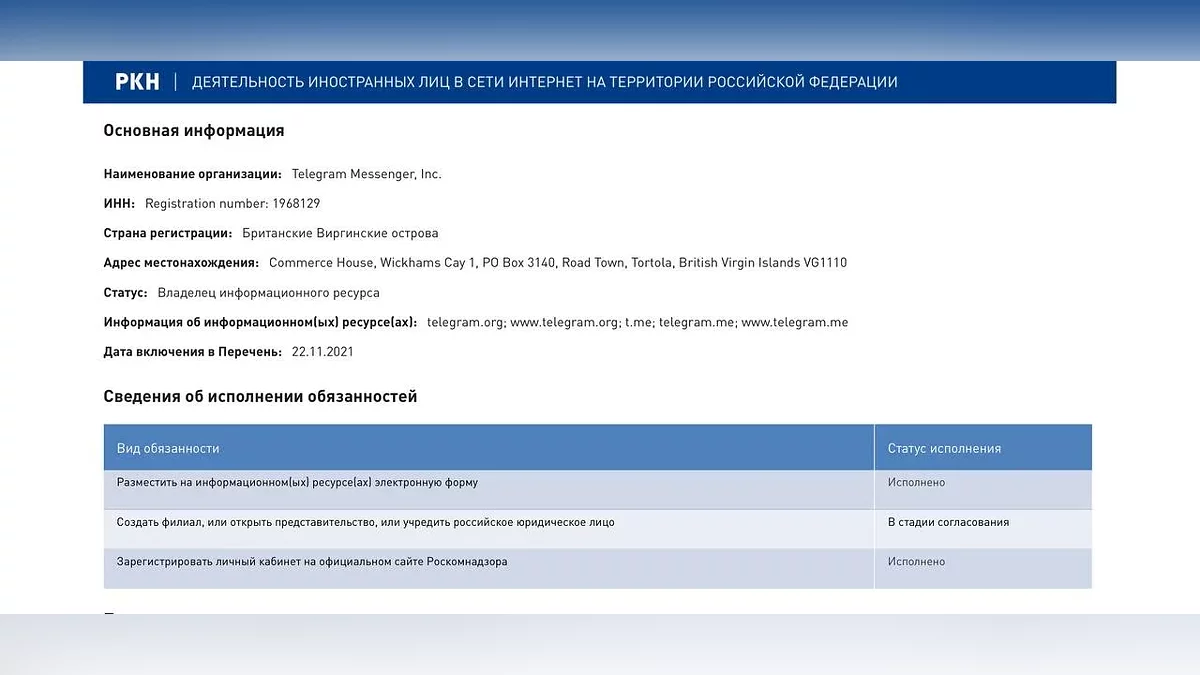 Согласно реестру, компания Павла Дурова подала документы на согласование филиала или уполномоченного юрлица. Это последнее из трех требований закона «О деятельности иностранных лиц в интернете», действующего с 2022 года. Ранее Telegram уже выполнил два условия: регистрацию личного кабинета в РКН и размещение формы обратной связи.