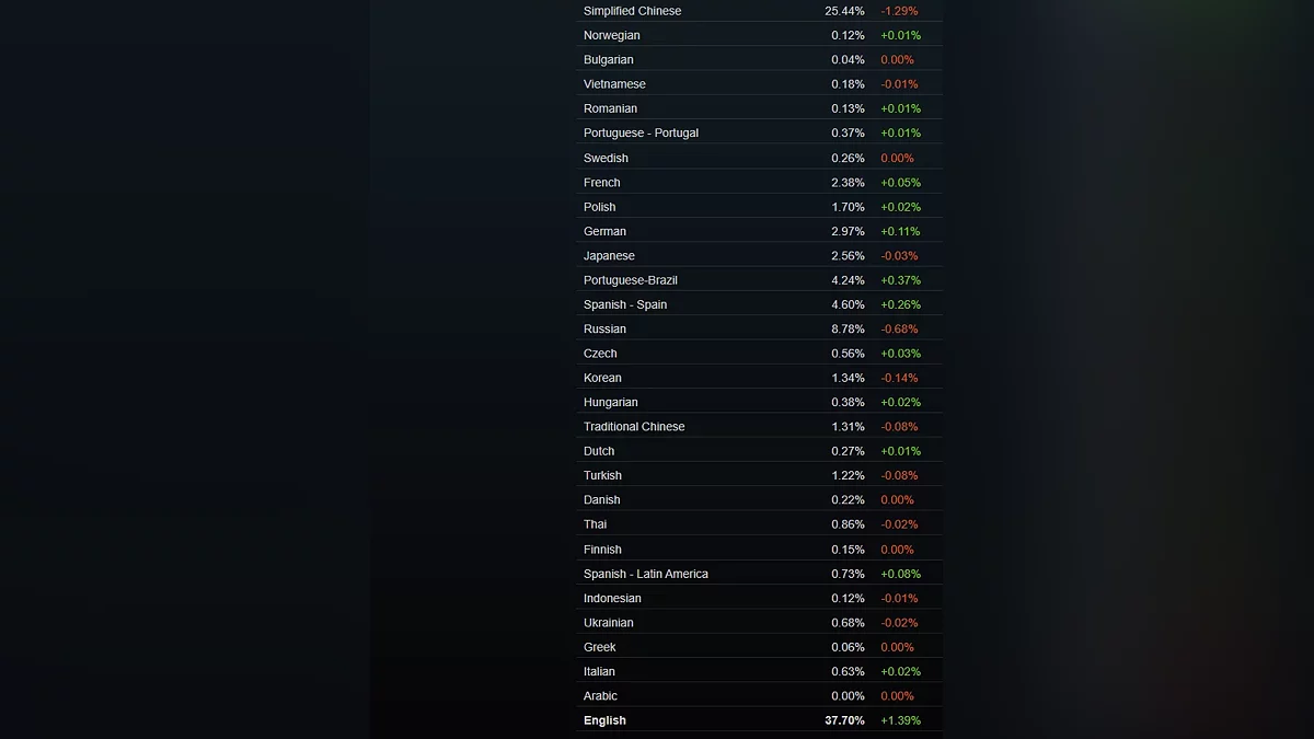 Самым популярным языком по-прежнему является английский — 37,70%. Далее идут упрощенный китайский (25,44%) и русский (8,78%).