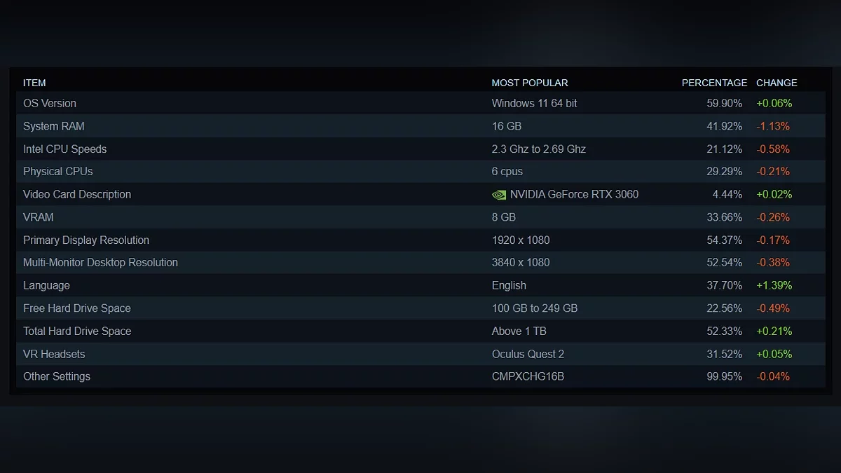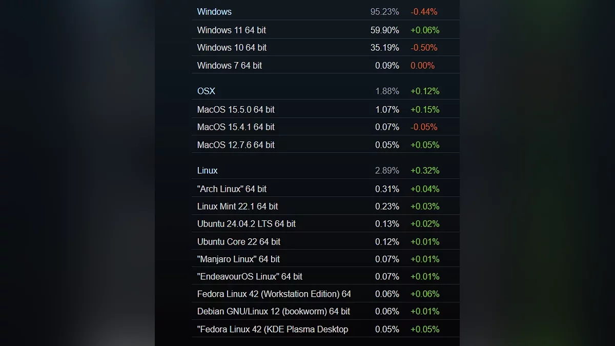 Что касается операционных систем, в июле Windows 11 64 bit немного укрепила свое лидерство (на 0,06%). Сейчас эта ОС установлена у 59,90% пользователей Steam. Доля Windows 10 64 bit составляет 35,19%, а Windows 7 64 bit — 0,09%.