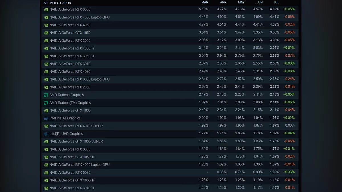 В топ-5 самых популярных видеокарт в июле попали RTX 3060 (4,62%), RTX 4060 Laptop (4,43%), RTX 4060 (4,39%), GTX 1650 (3,30%) и RTX 3050 (3,08%).