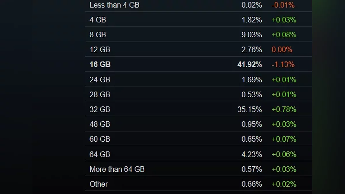 Количество оперативной памяти в размере 16 ГБ установлено у 41.92% пользователей, а 32 ГБ у 35,15%.