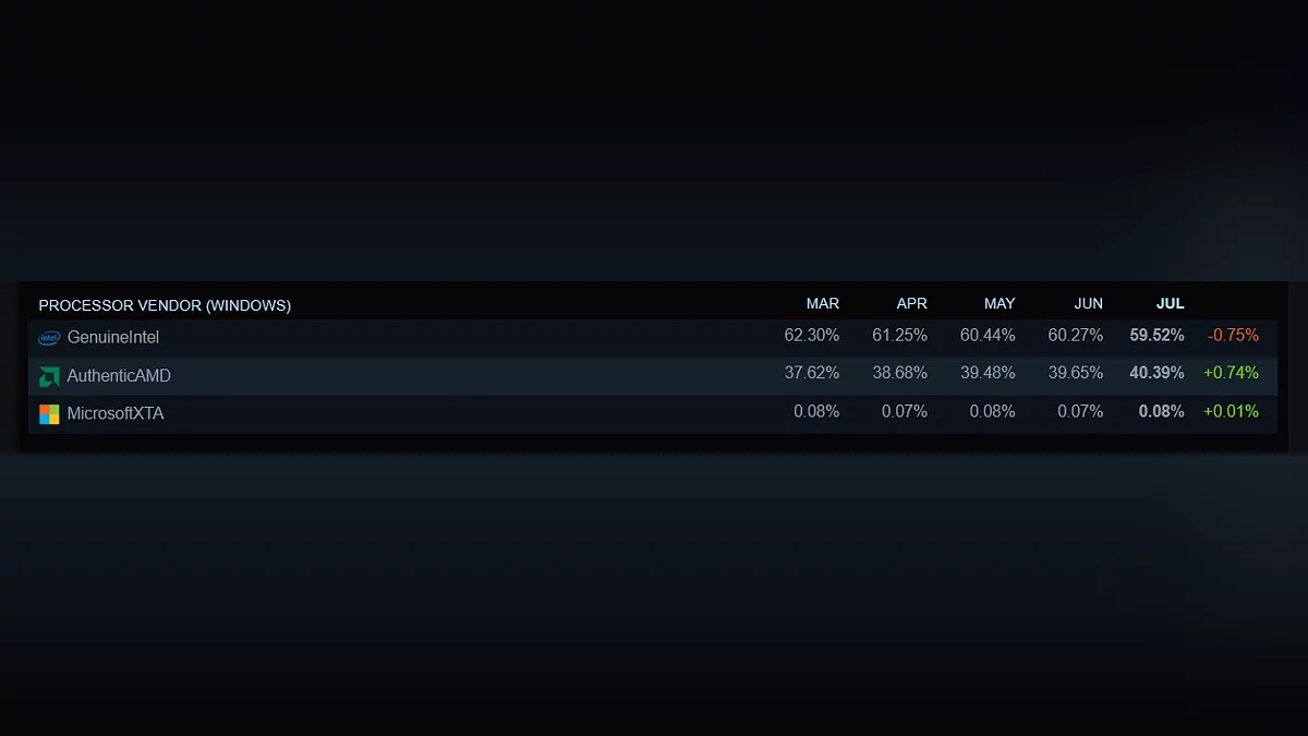Среди процессоров ситуация почти не изменилась. Доля AMD выросла на 0,74% и в целом составляет 40,39%. У Intel при этом 59,52%.