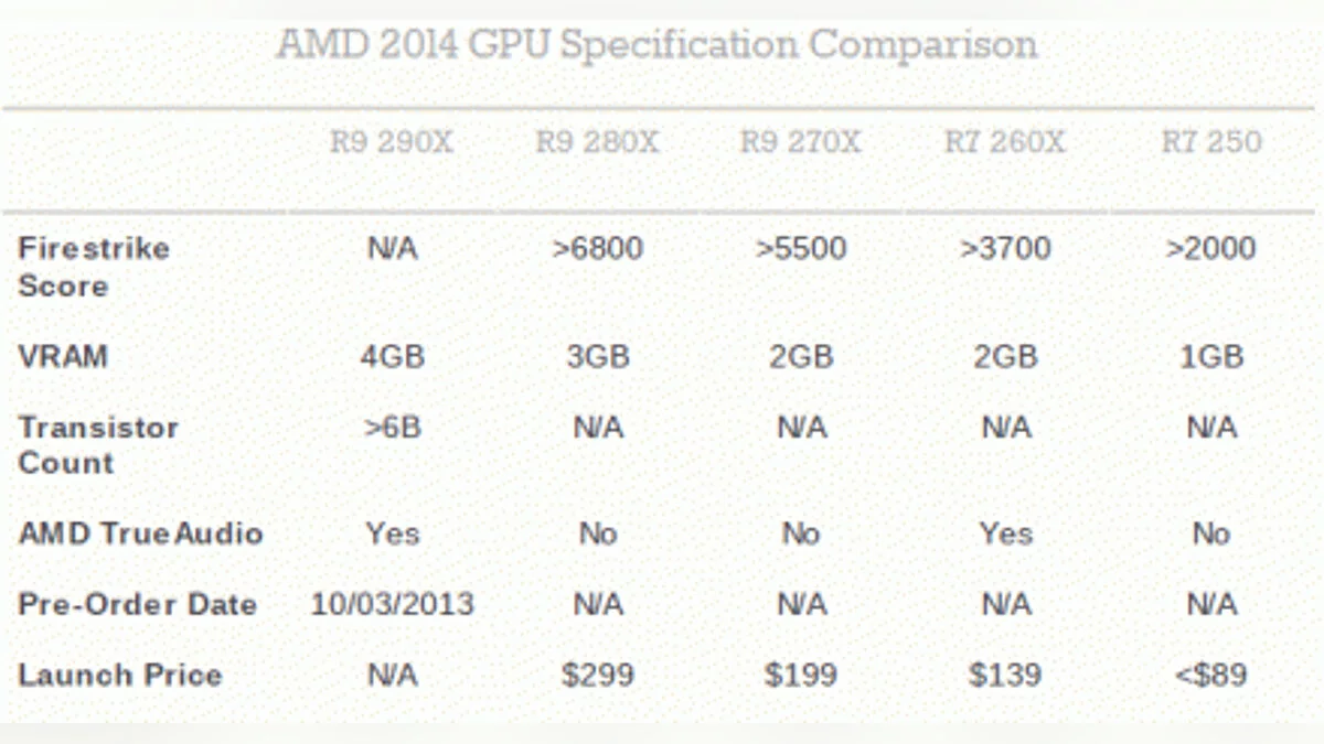 UPD: Модели Radeon R7 250 будут оснащаться 1 ГБ памяти GDDR5 и иметь стоимость ниже 100 $ (около 3 200 рублей). Radeon R7 260X и Radeon R9 270X получат ценники в 139 $ (около 4 450 рублей) и 199 $ (около 6 400) соответственно и будут иметь на борту уже 2 ГБ GDDR5-памяти. Вторая модель в рядах R9 — 280X — получит 3 ГБ такой же памяти, однако цена поднимется до 299 $ (около 9 600 рублей).